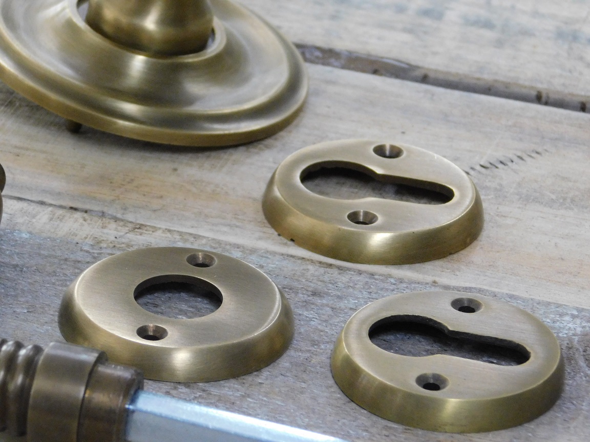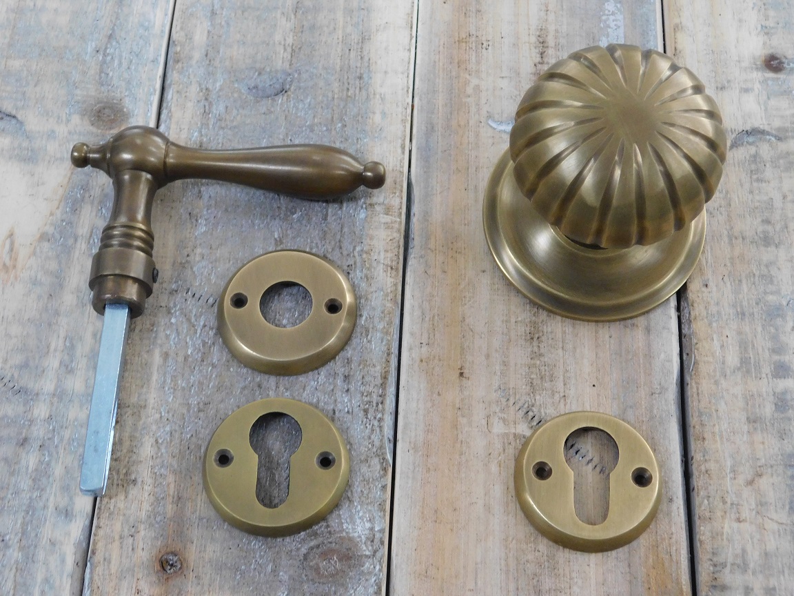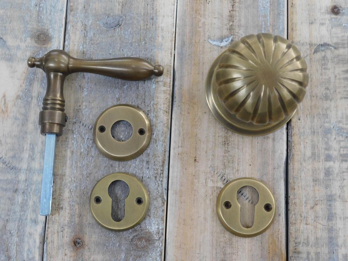 Lieferumfang: 1 Türknauf mit großer Knauf-Rosette + 1 Türklinke+1 Klinkenrosette, 2 Schloss-Rosetten, Messing patiniert