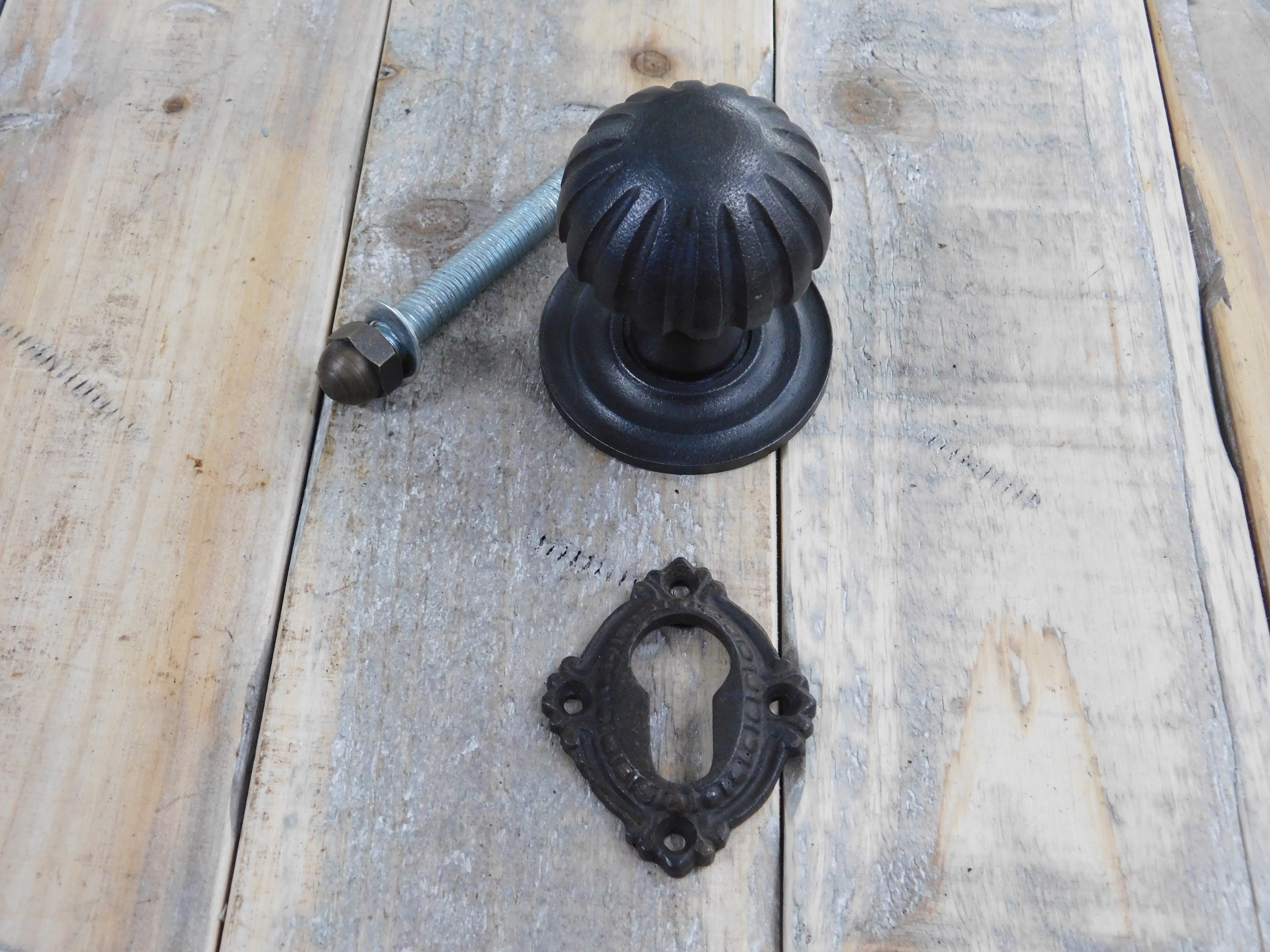 Das Set enthält 1 verzierten Knauf mit Rosette und 1 Schlüsselloch-Rosette mit einer ausreichend großen Öffnung, in die ein modernes Zylinderschloss passt.