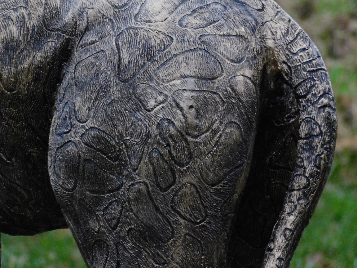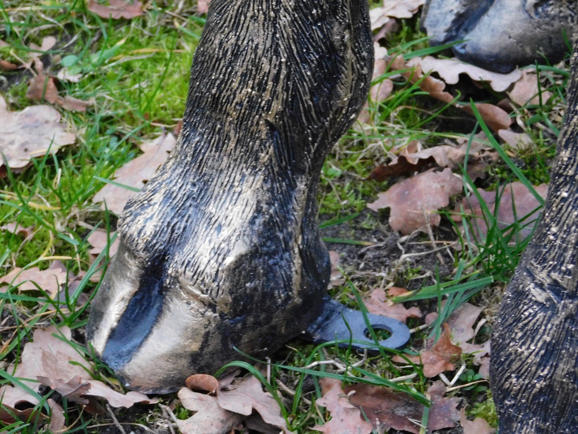 Die Befestigungslöcher in den Beinen ermöglichen es, die Statue fest im Boden zu verankern, ideal für den Außenbereich.