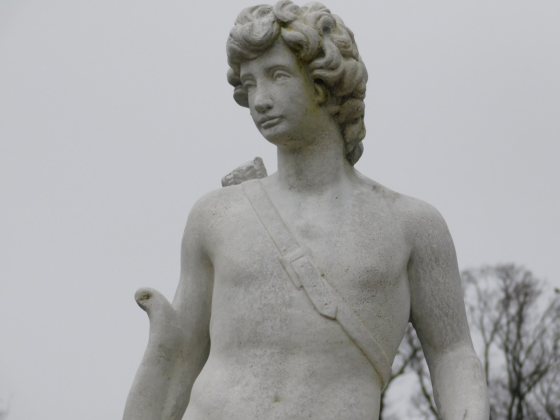 Ganz aus Stein gefertigt, verkörpert diese beeindruckende Gartenstatue die Symbolik des Schutzpatrons der Jäger, Optiker, Bogenschützen und Tierärzte.