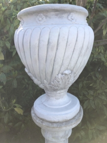 Schöne Vase aus voll gegossenem Stein und daher schwer, kann bei jedem Wetter stehen. An der Unterseite befindet sich ein Wasserloch, so dass er bei frostigem Wetter draußen stehen bleiben kann.