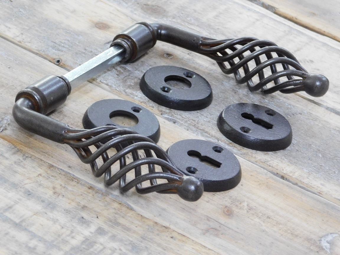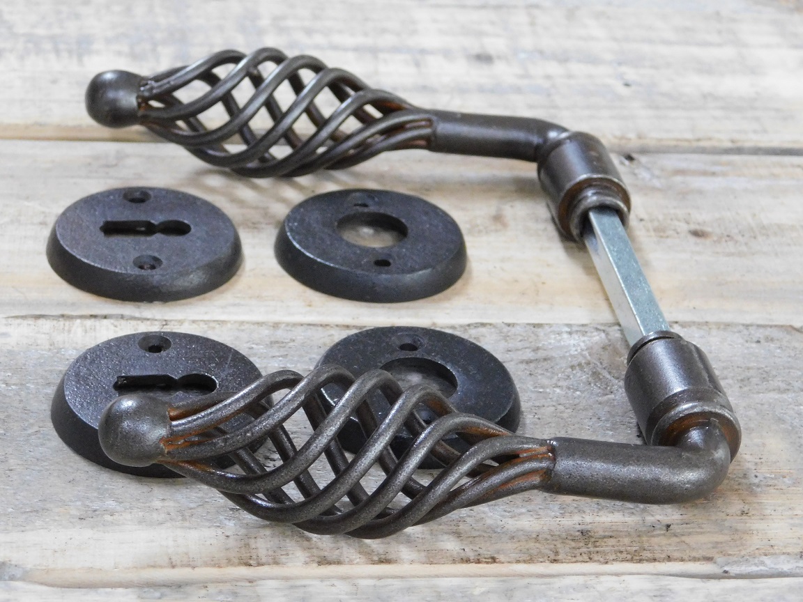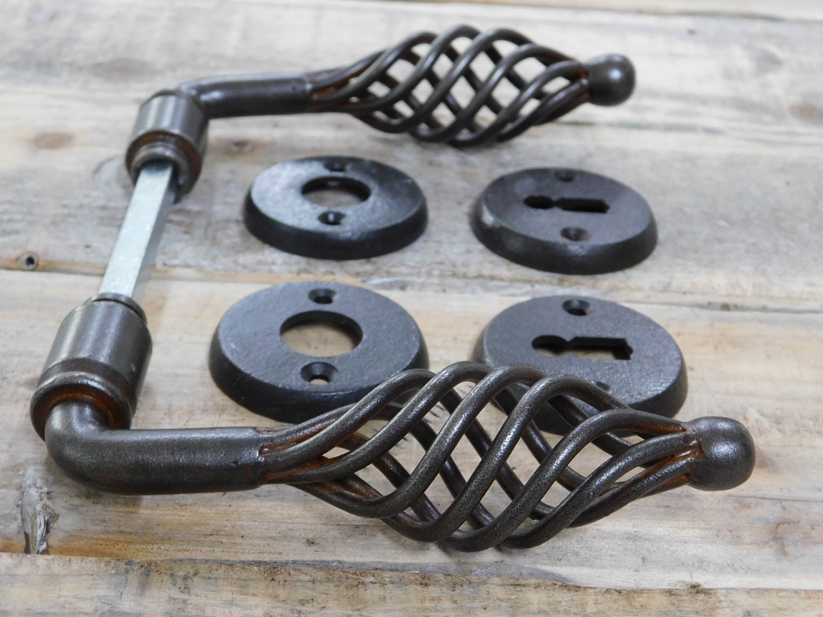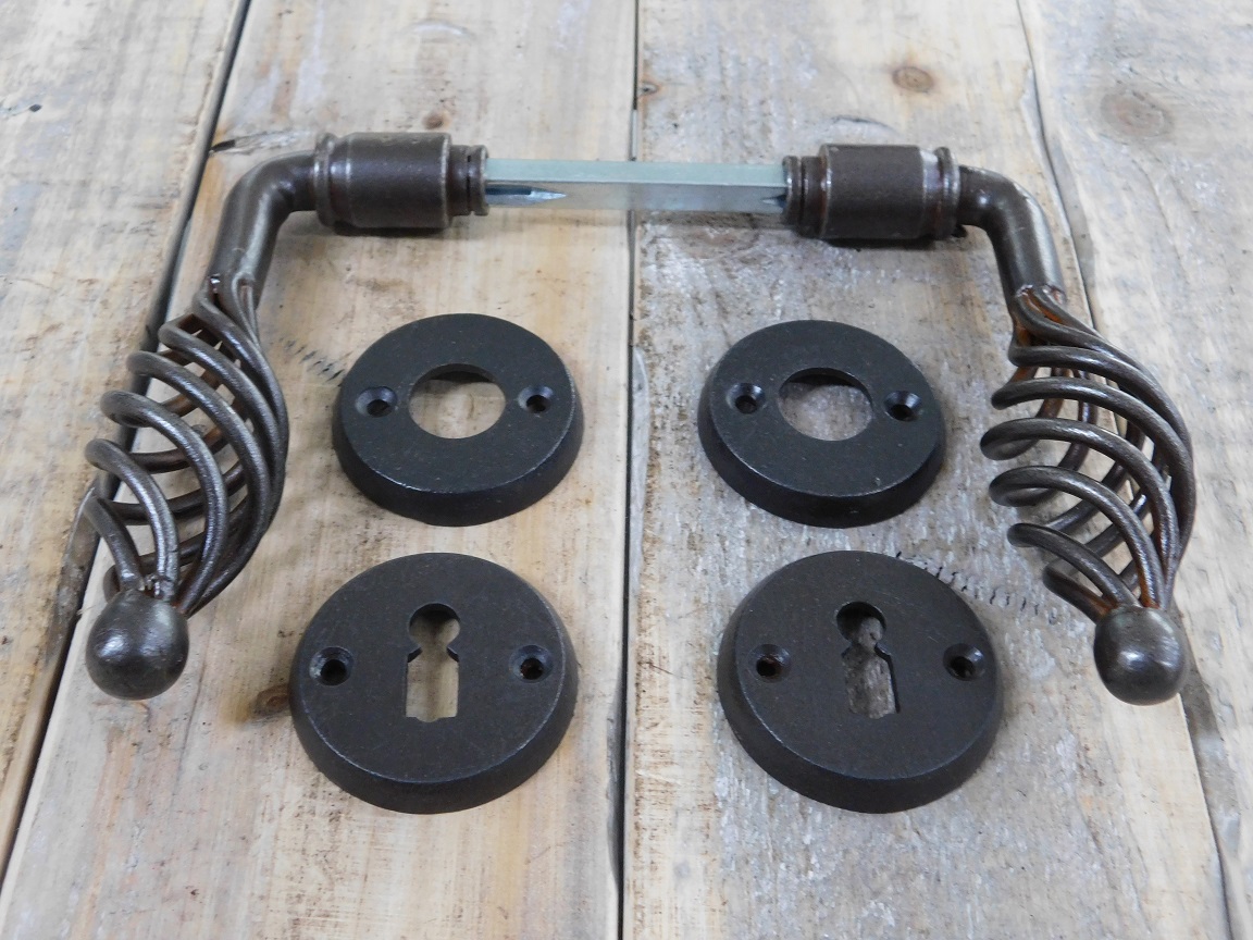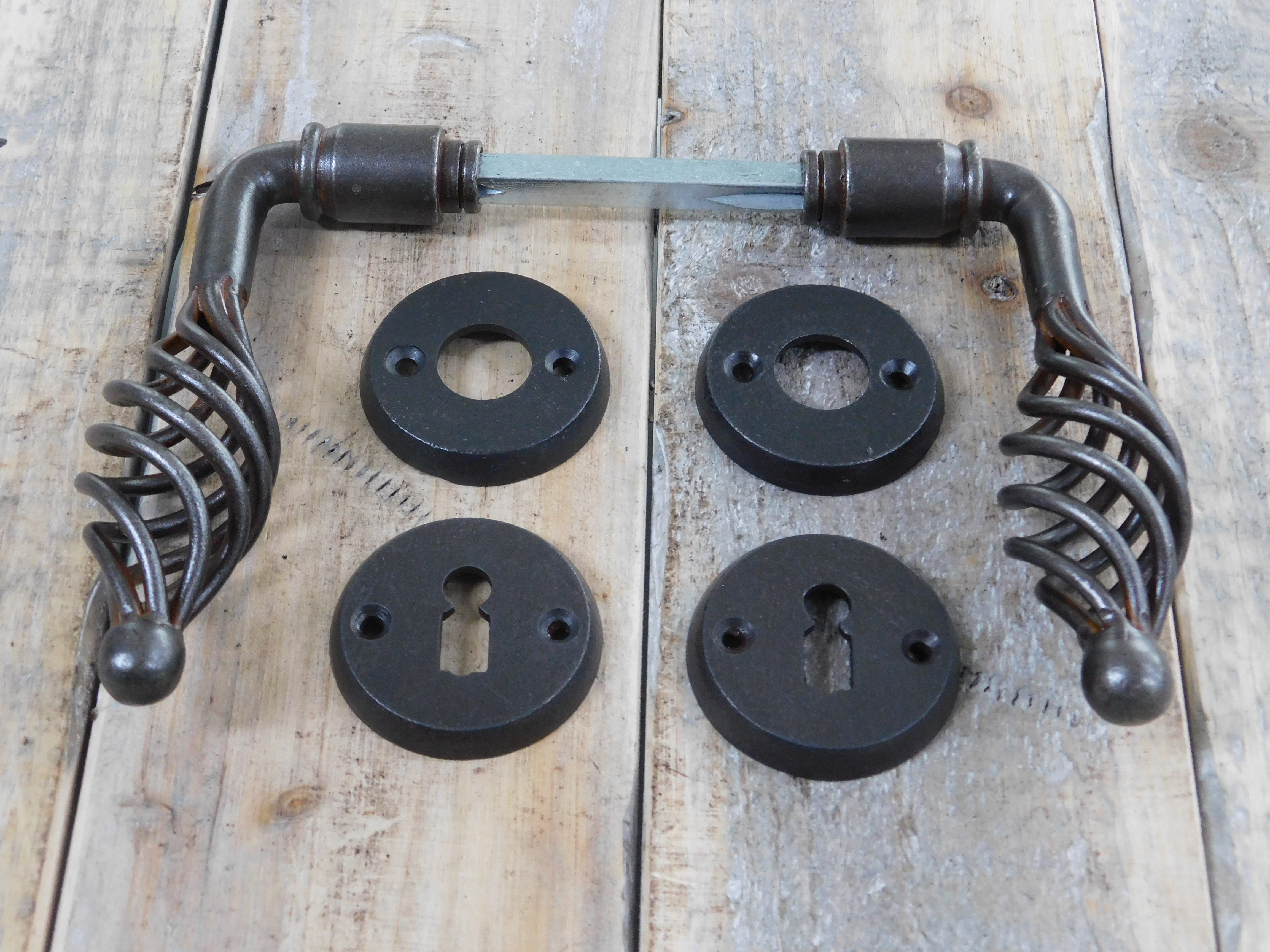 Dieser Satz Türbeschläge umfasst zwei Türgriffe, zwei Klinkenrosetten und zwei Schlossrosetten, die alle aus langlebigem antiken Eisen gefertigt sind.