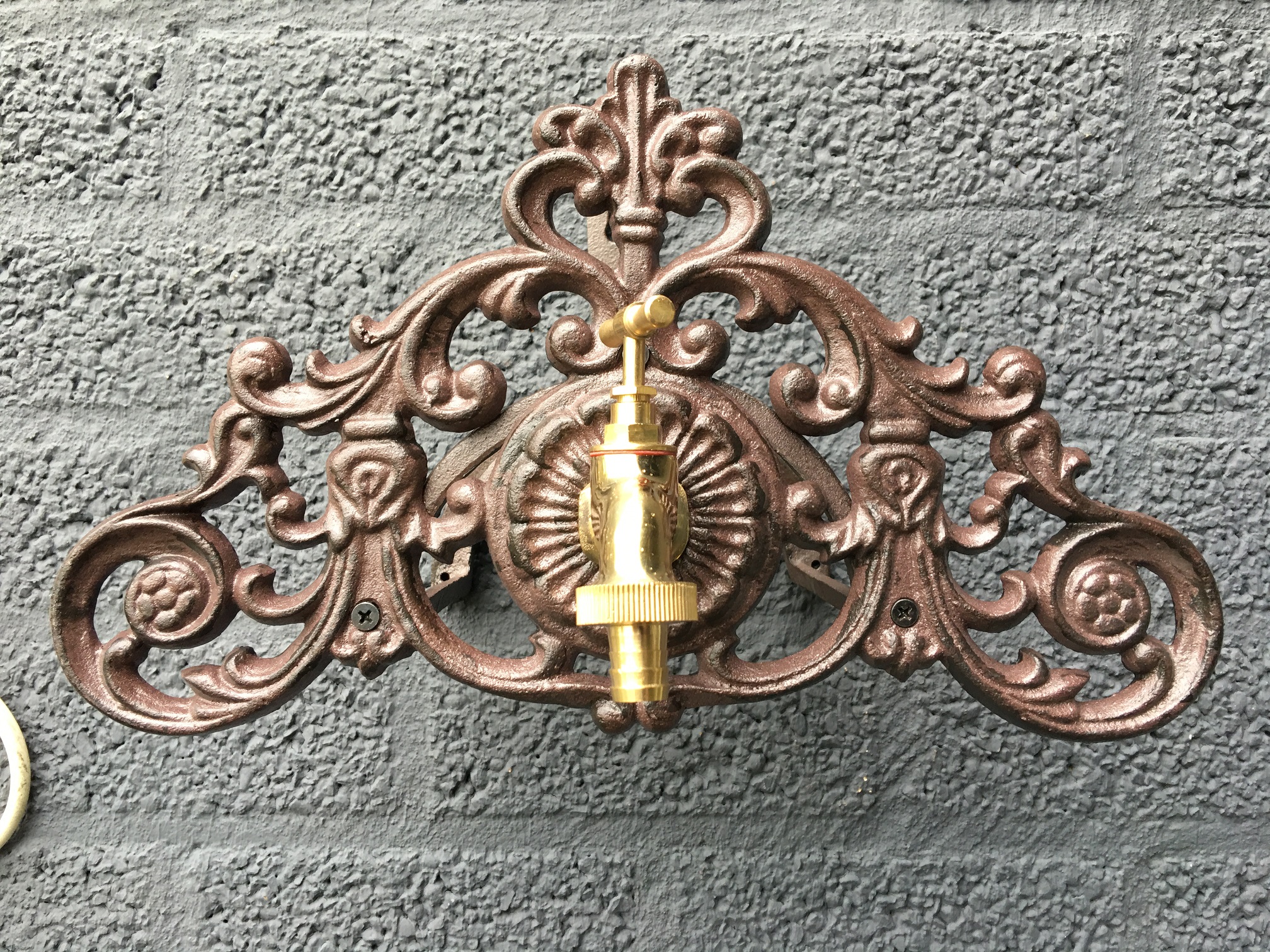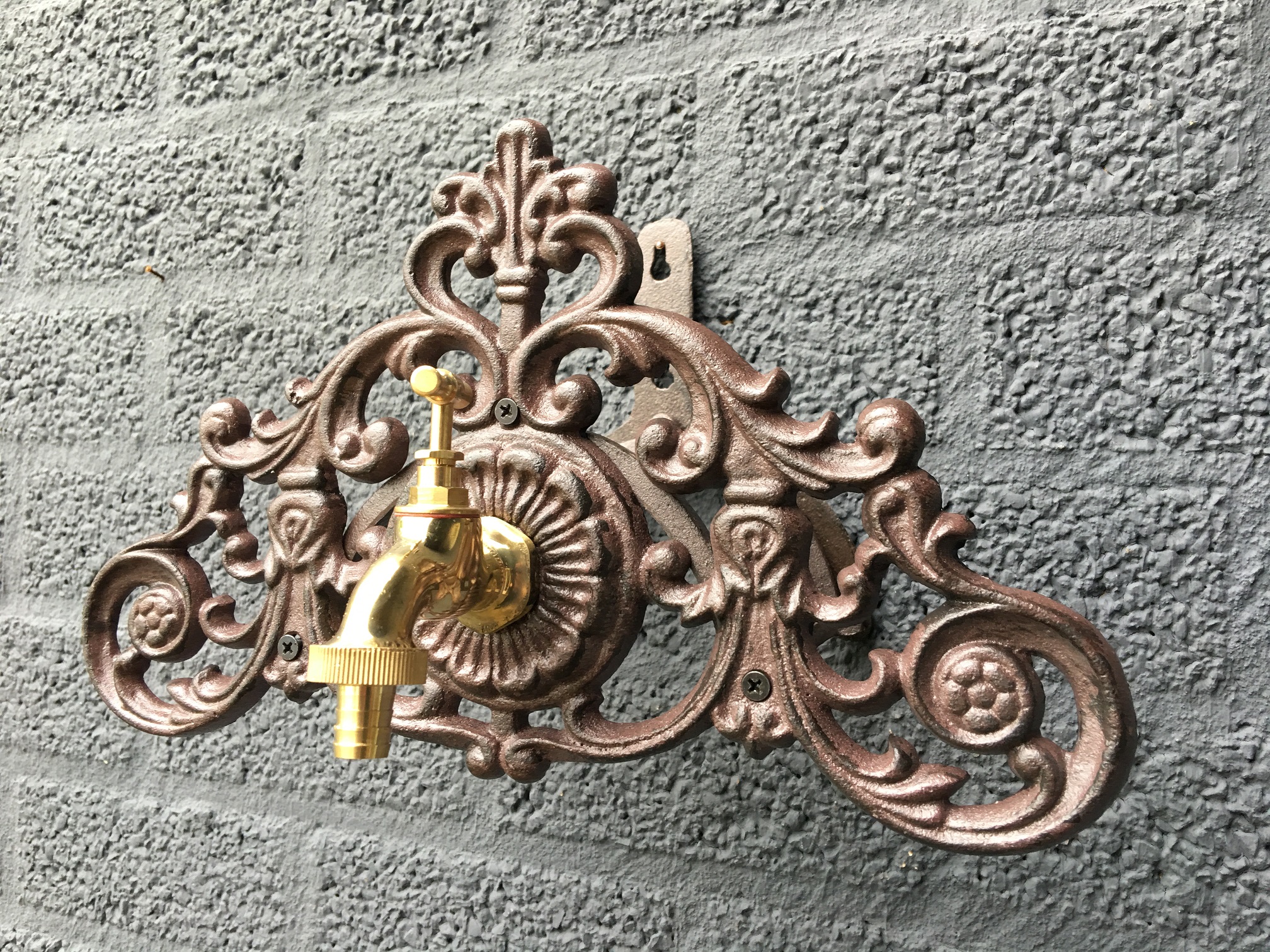 Schöner Gartenschlauchhalter aus Gusseisen mit einem Messinghahn und Adapter zum Anschluss des Gartenschlauchs.