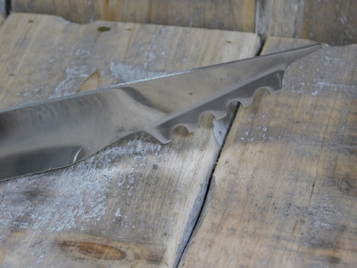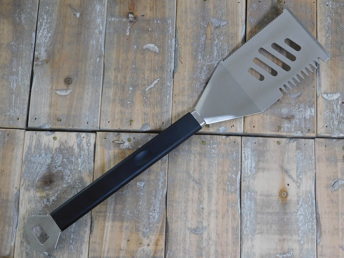 An der Unterseite des Spatels befindet sich ein Flaschenöffner. Der Spatel selbst hat auf beiden Seiten Schneidkanten zum Schneiden des Fleisches!