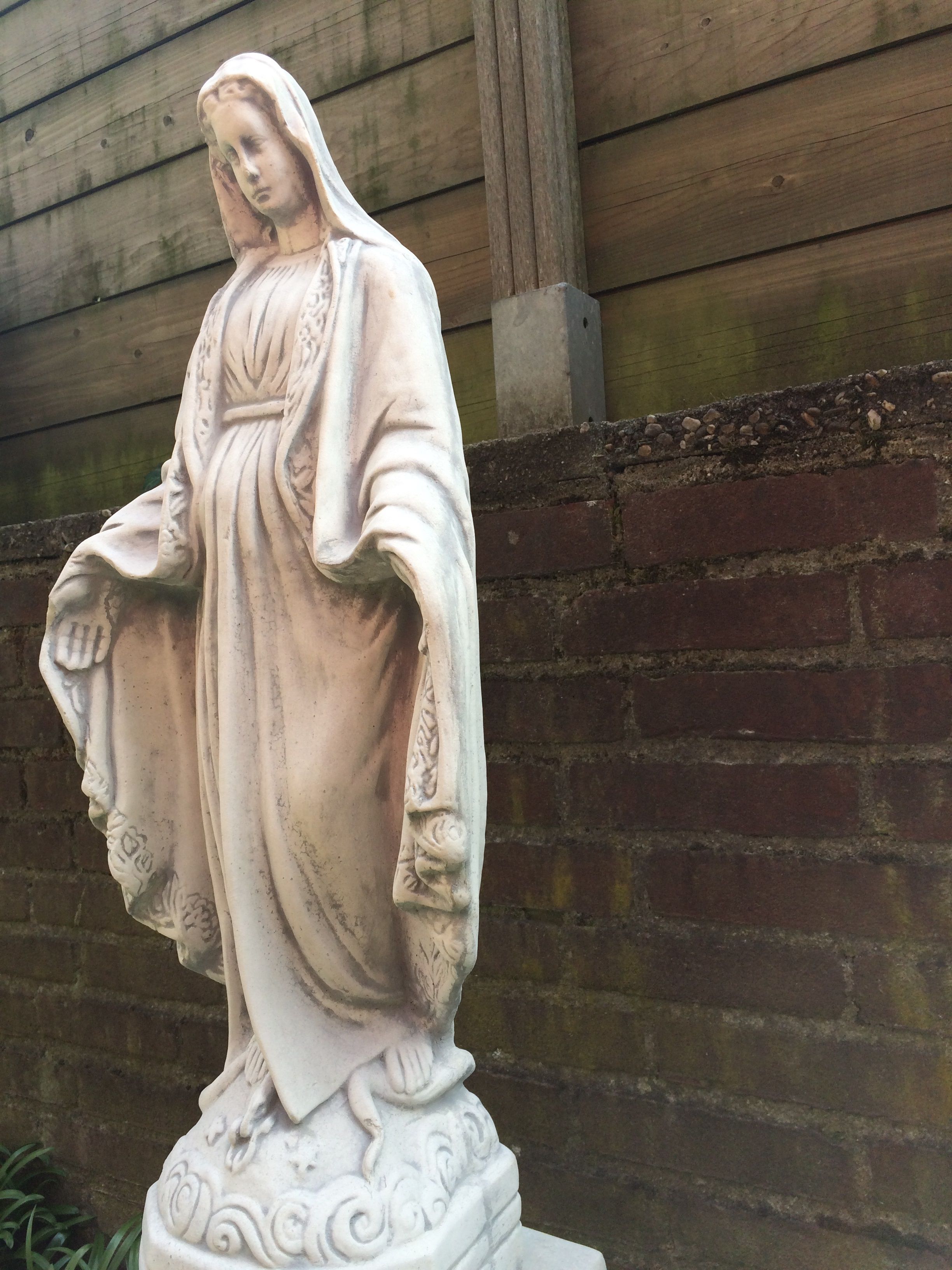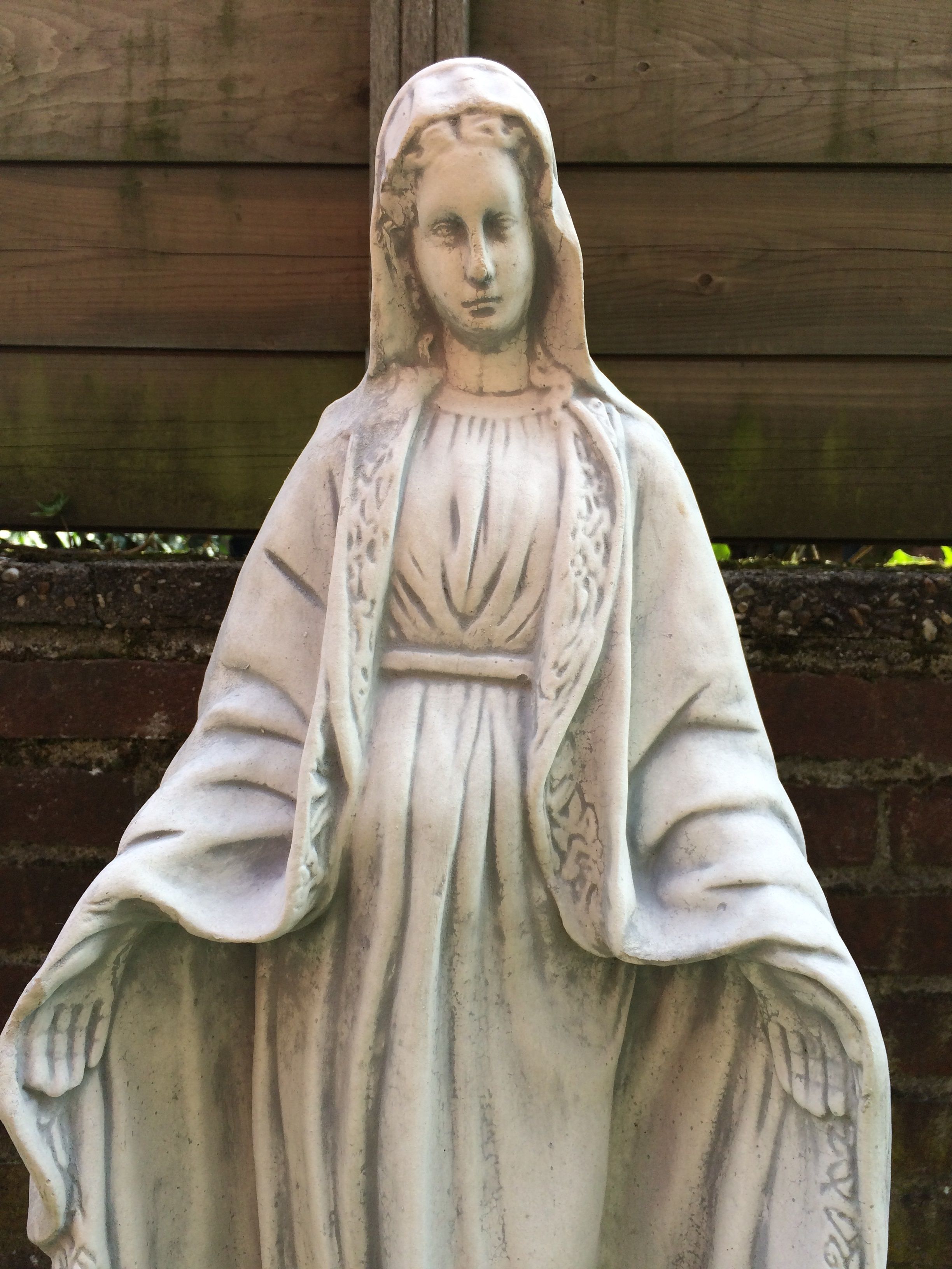 Marienstatue auf Sockel, massiv und schwer, so dass sie bei Wind und Wetter aufgestellt werden kann. Das Wetter wird die Farbe der Statue verändern