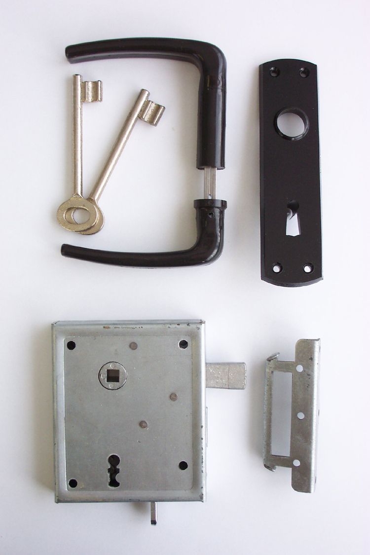 Universal-Auflageschloss, mit schwarzer Griffgarnitur. Geeignet für einwärts und auswärts öffnende Türen, rechts und links verwendbar.