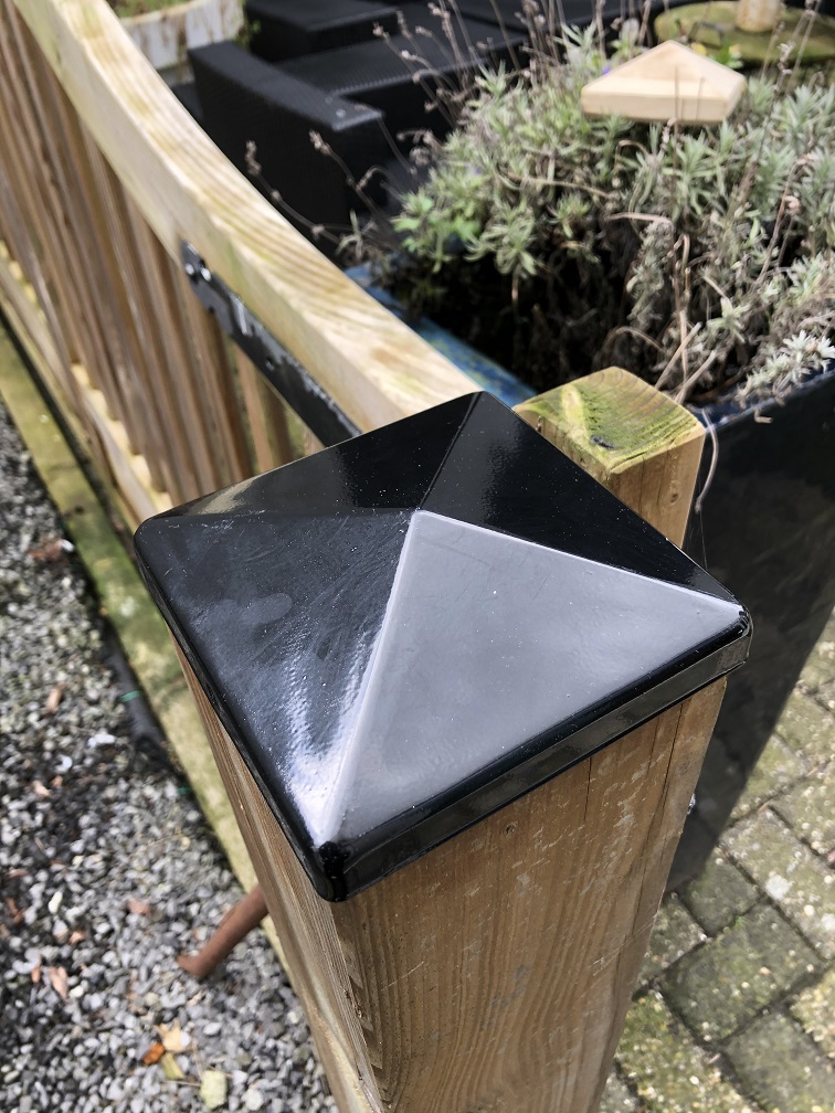 Dieser schlichte Pfostendeckel ist aus Metall in der Farbe Schwarz gefertigt.