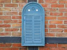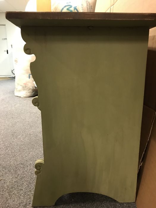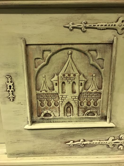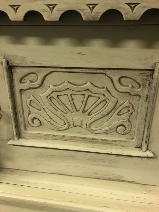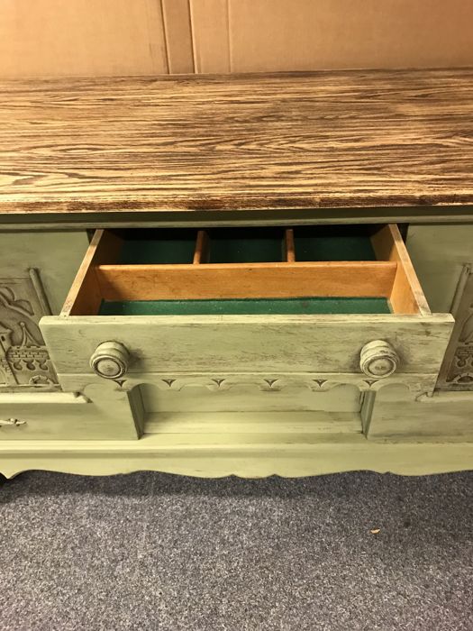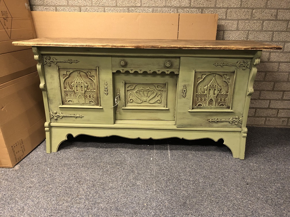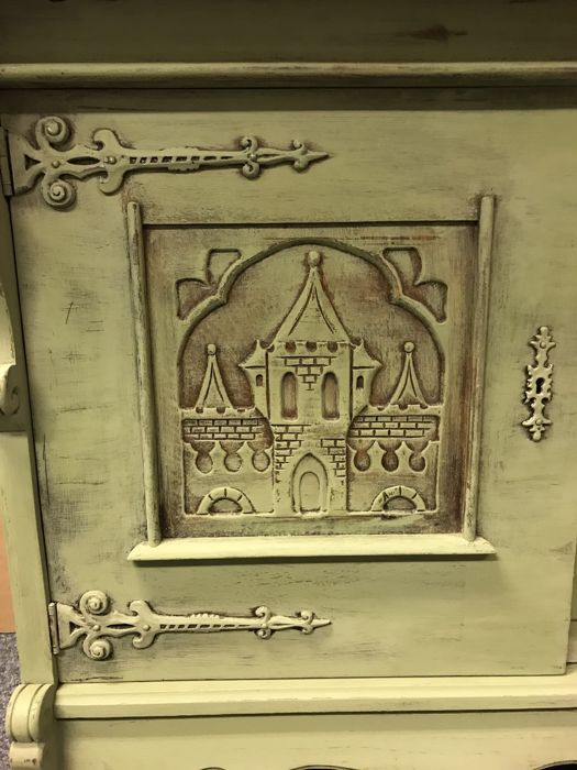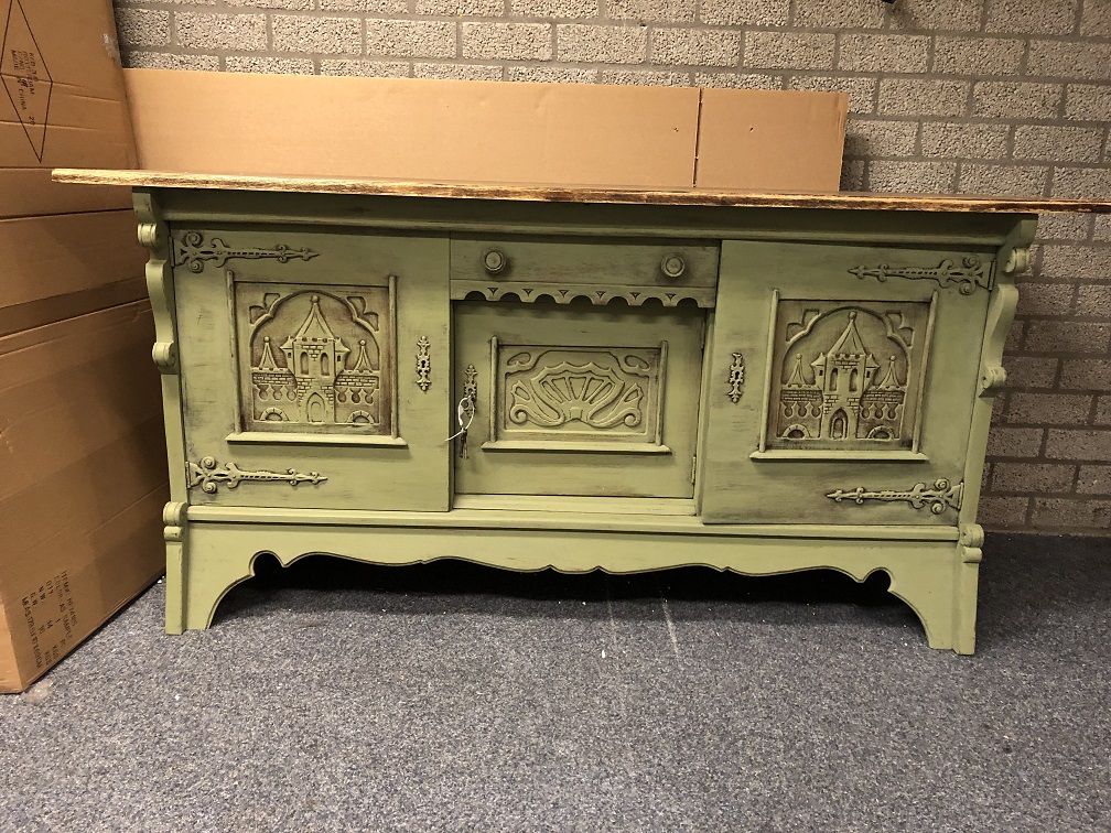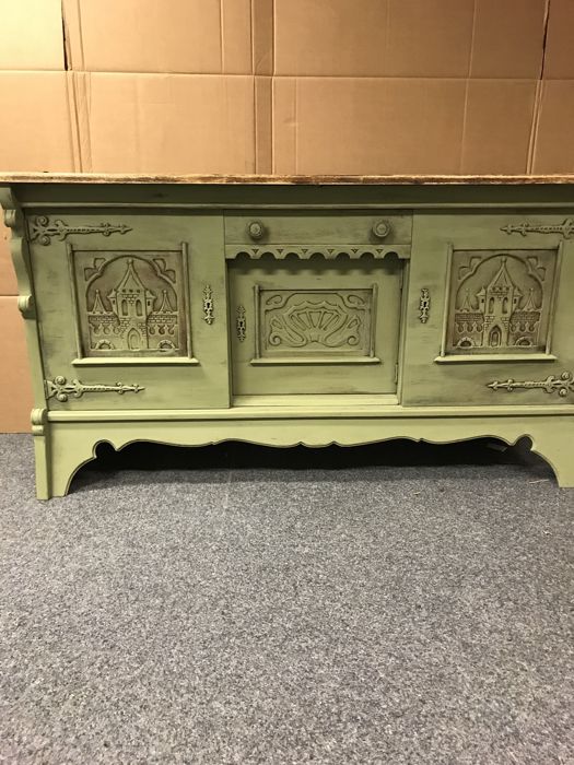 Diese englische Anrichte aus Eiche stammt aus dem 19. Jahrhundert, sie ist bemalt und die Holzelemente sind mit Schlössern und Ornamenten verziert.