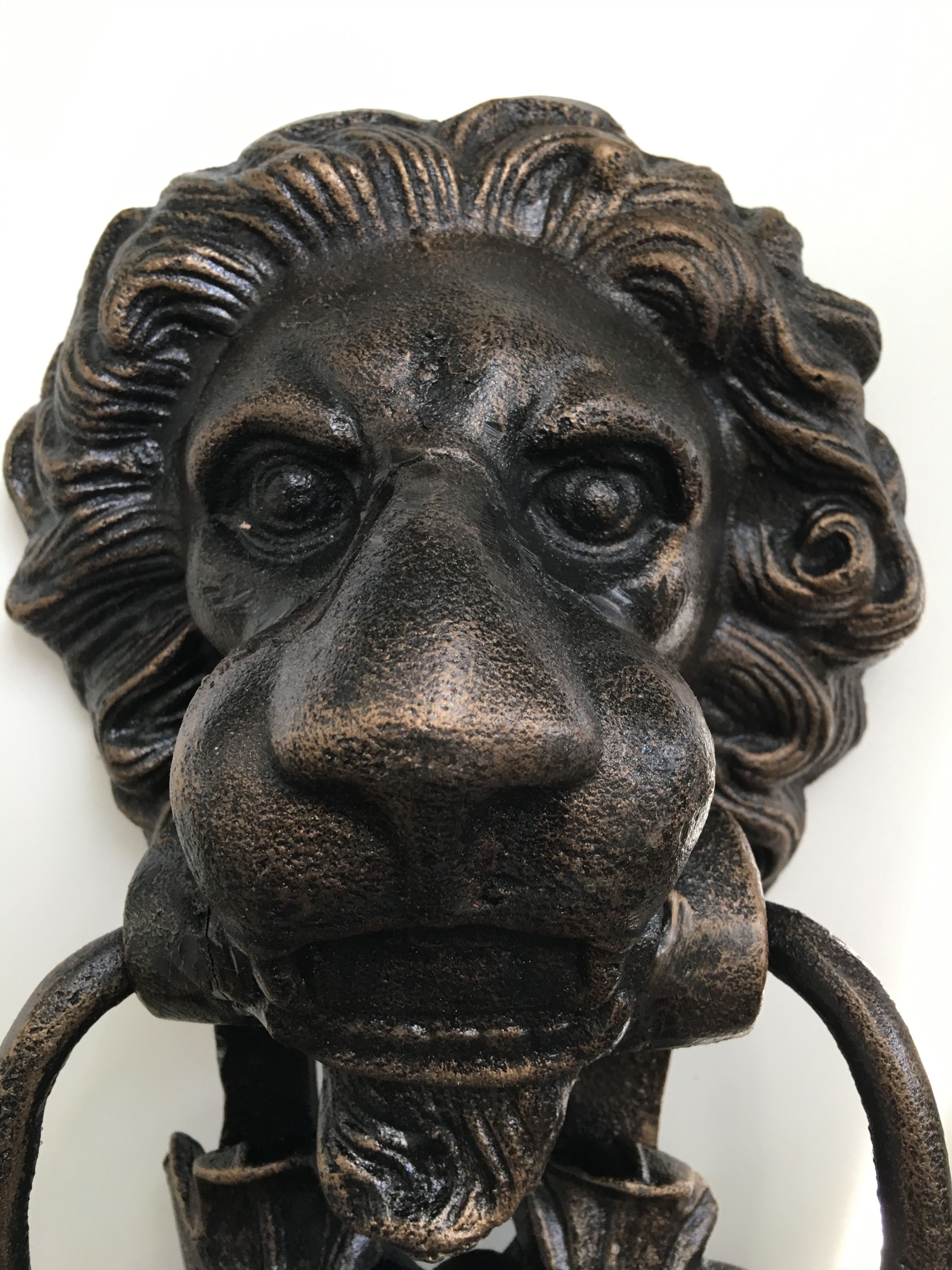 Die Lieferung umfasst: 1 Türklopfer großer Kopf Löwe, Gusseisen - wetterfest braun.