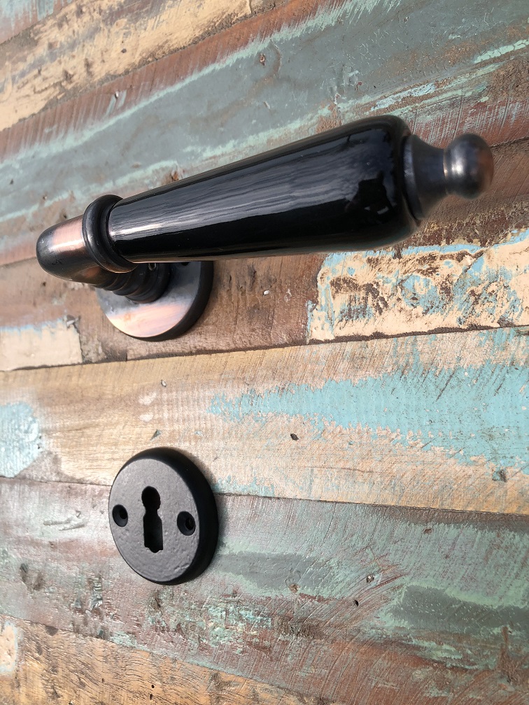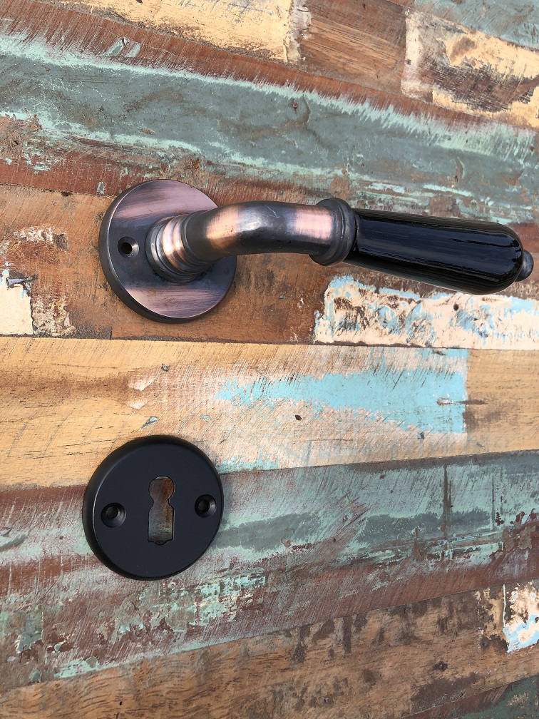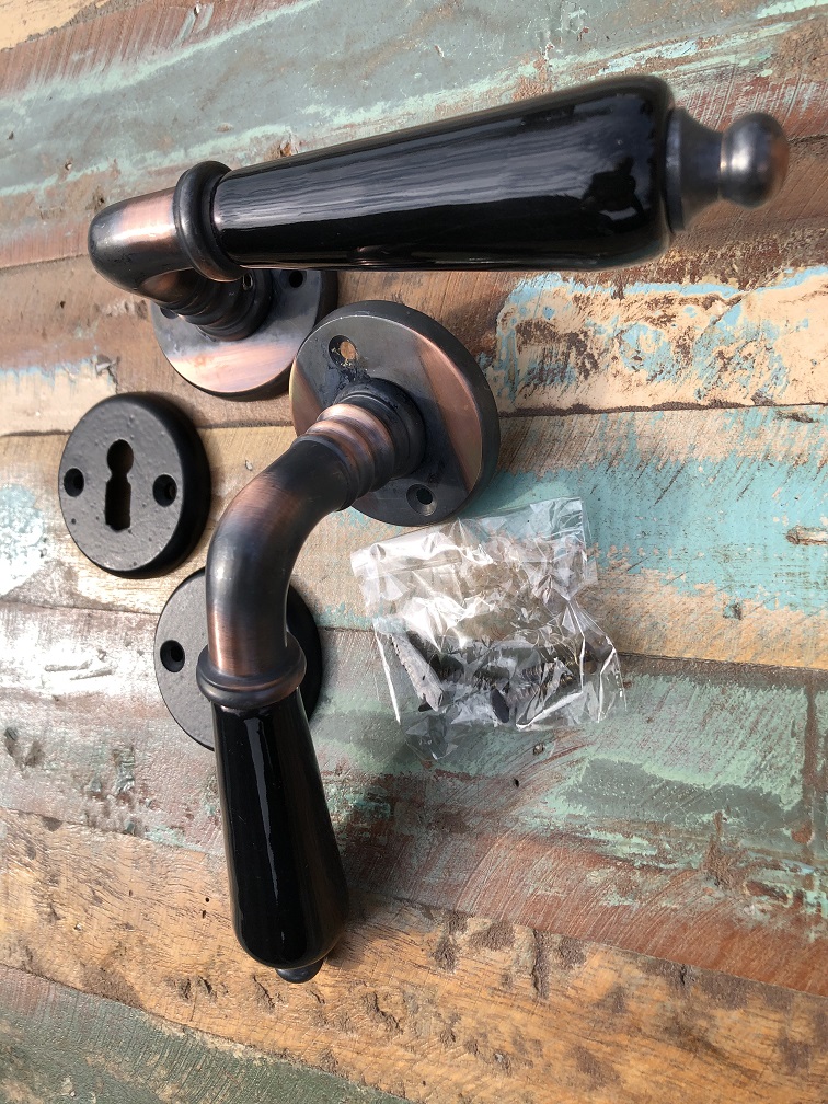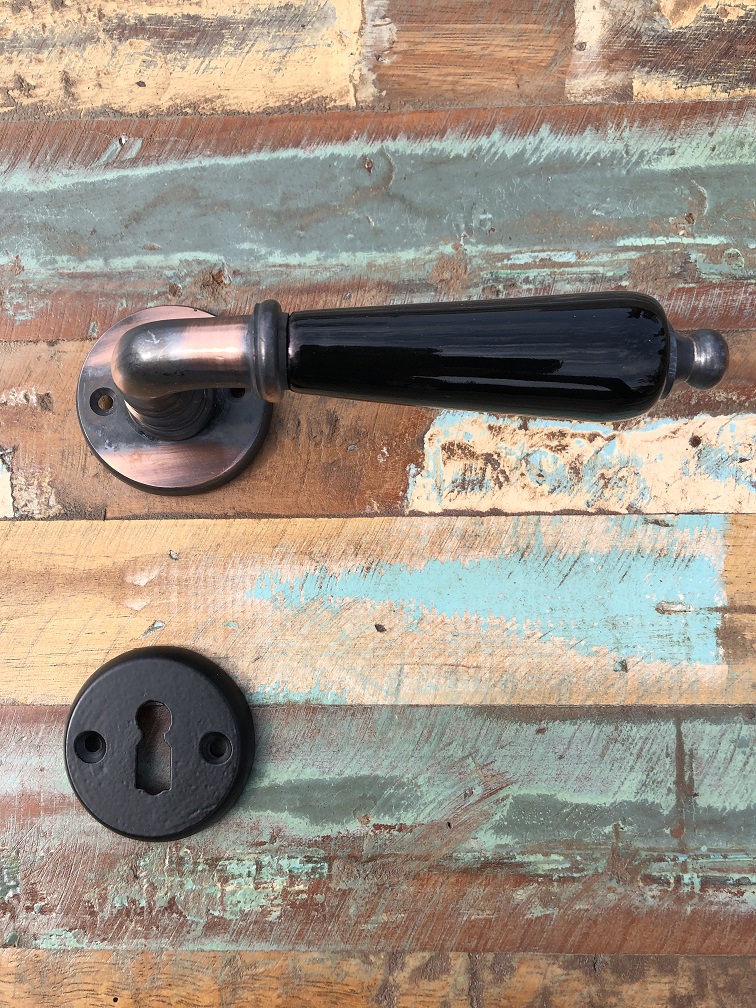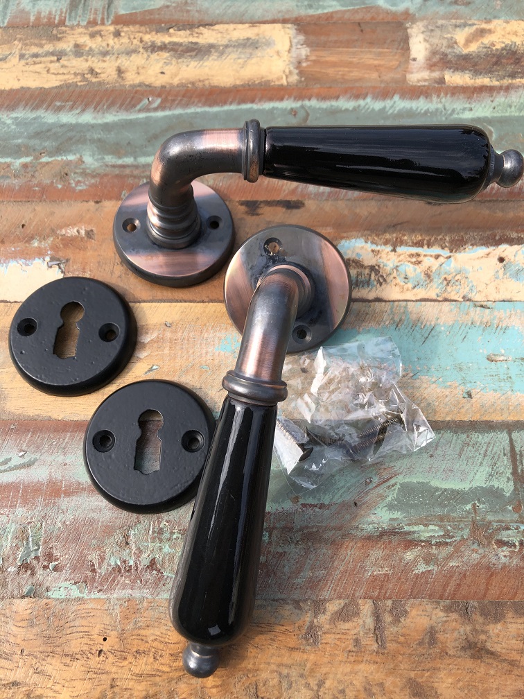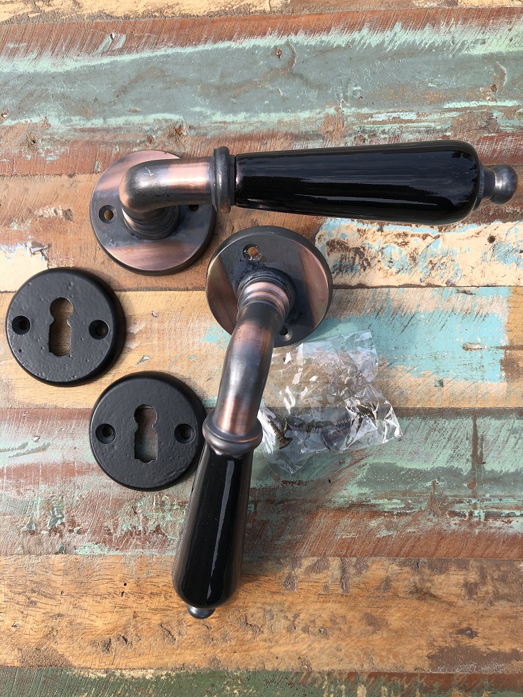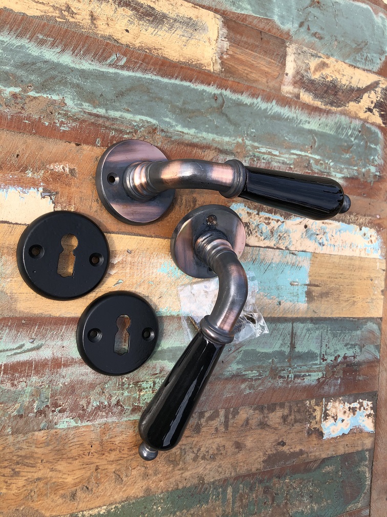 Artikelnr.: deurbeslag-set-Karn-I0-copper+ zwarte bb rozetten