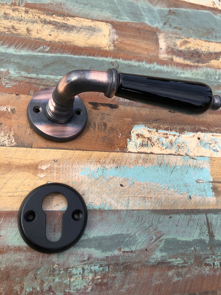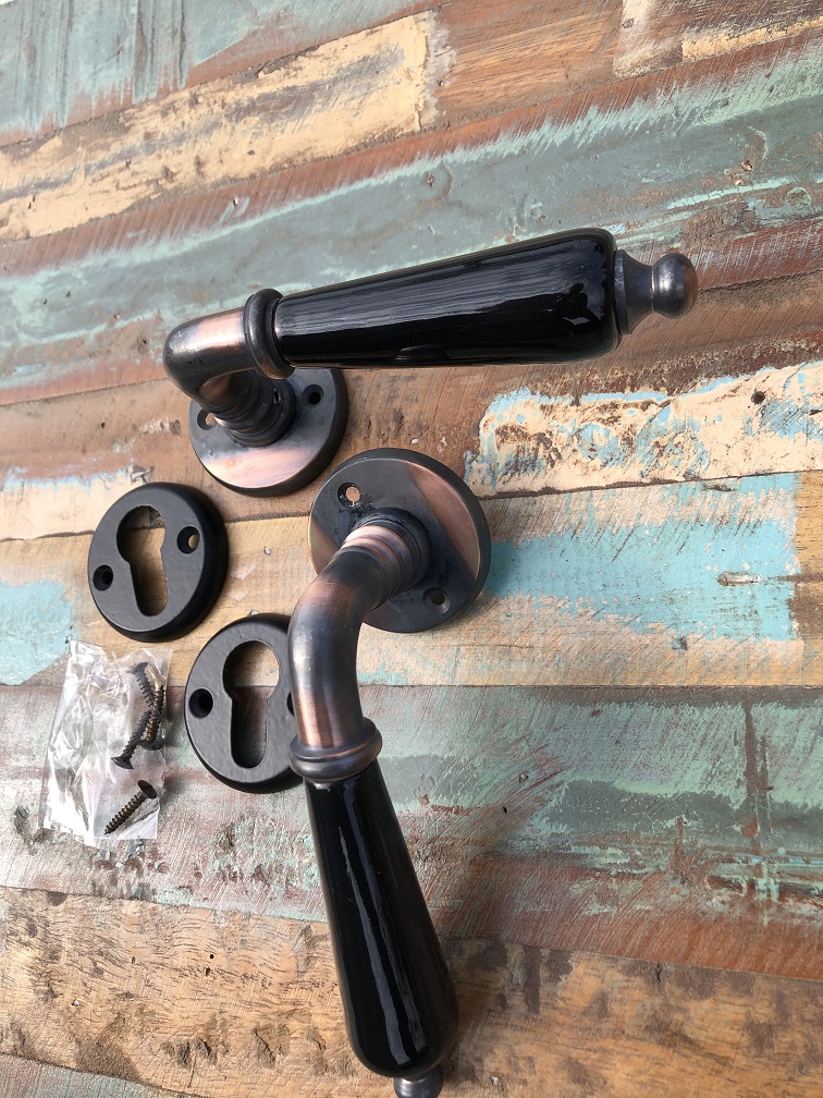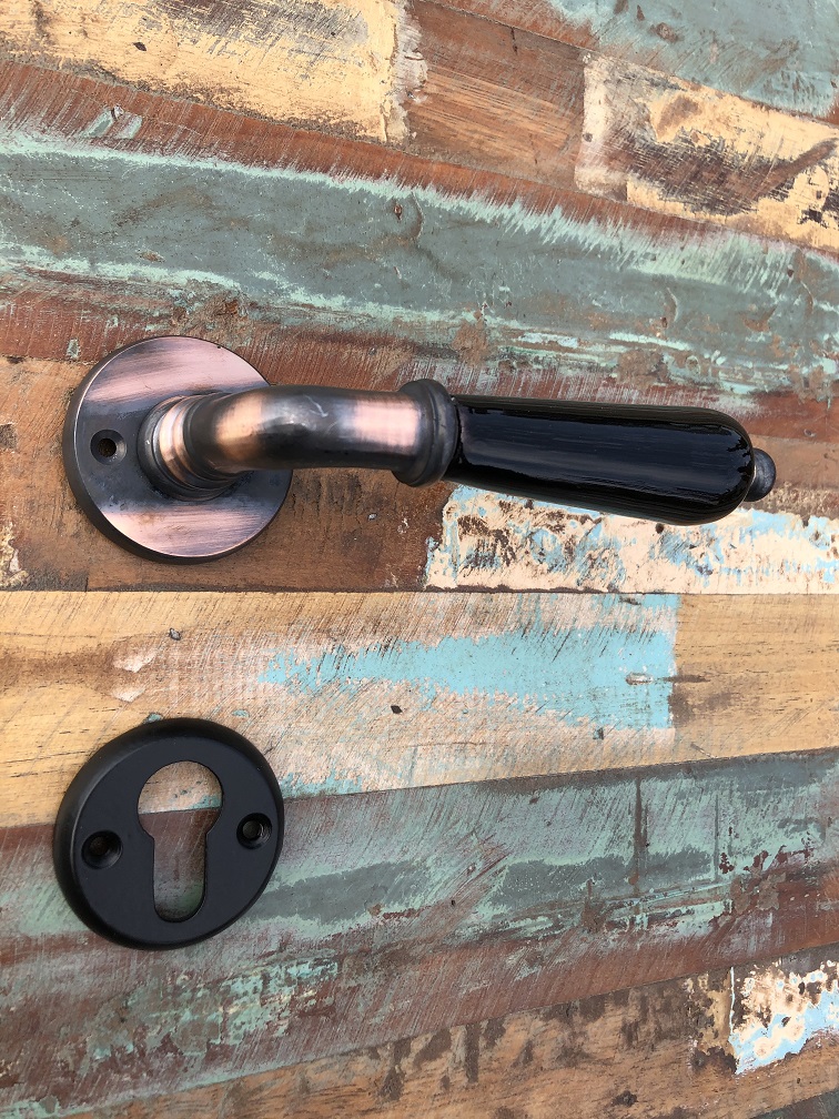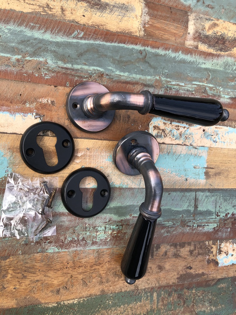 Schönes Türbeschlagset Karan-I0-Kupfer Antiklook mit schwarzen Keramikgriffen und schwarzen PZ-Rosetten
