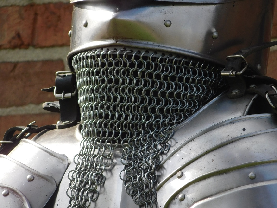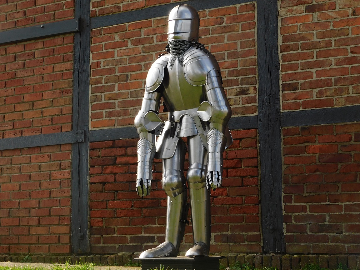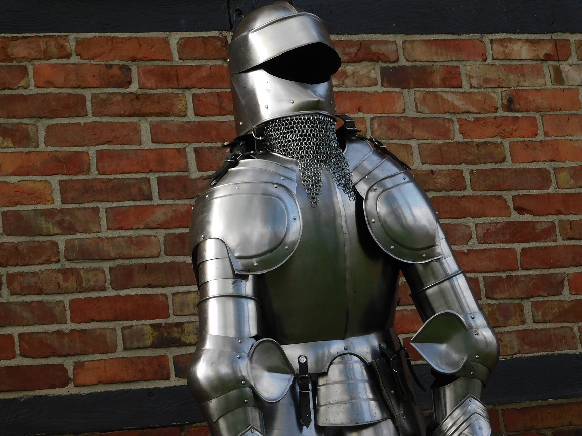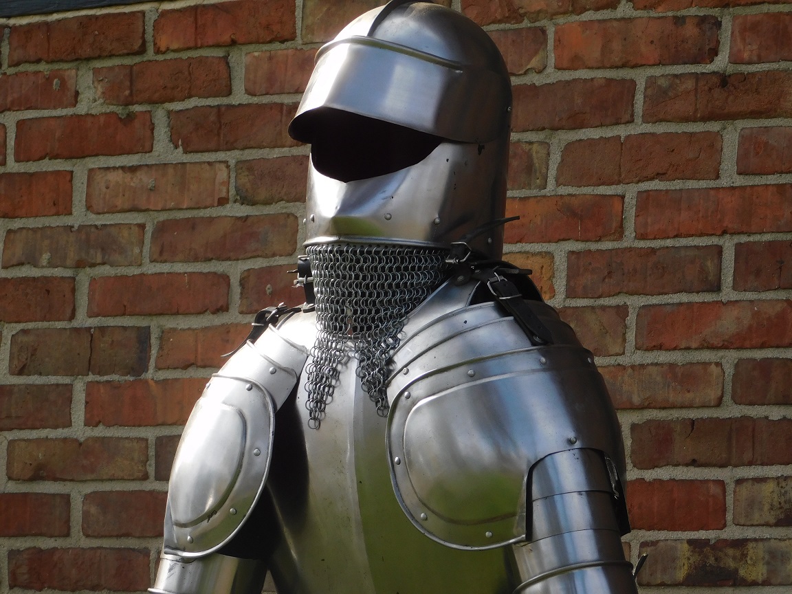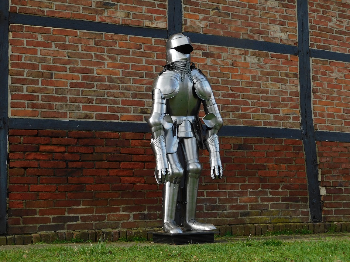 Ein kompletter Ritterharnisch besteht aus mehreren Teilen, darunter ein Brustpanzer, Schulterpolster, Arm- und Beinschutz und ein Helm.