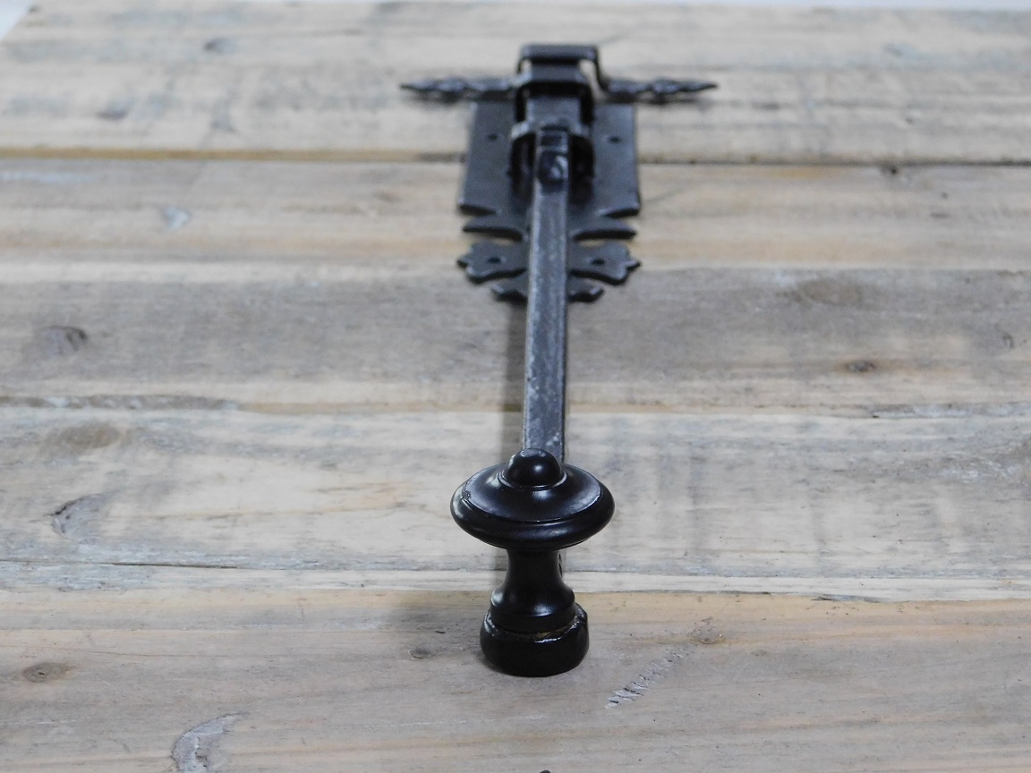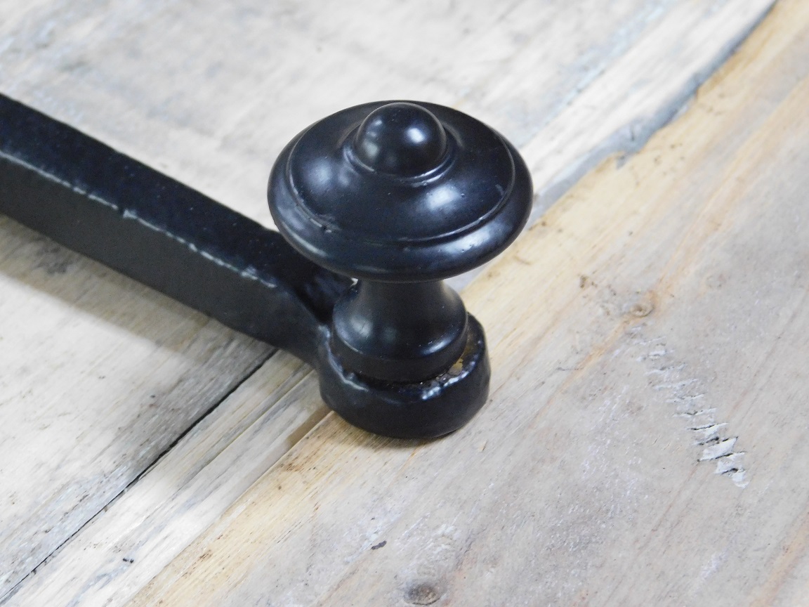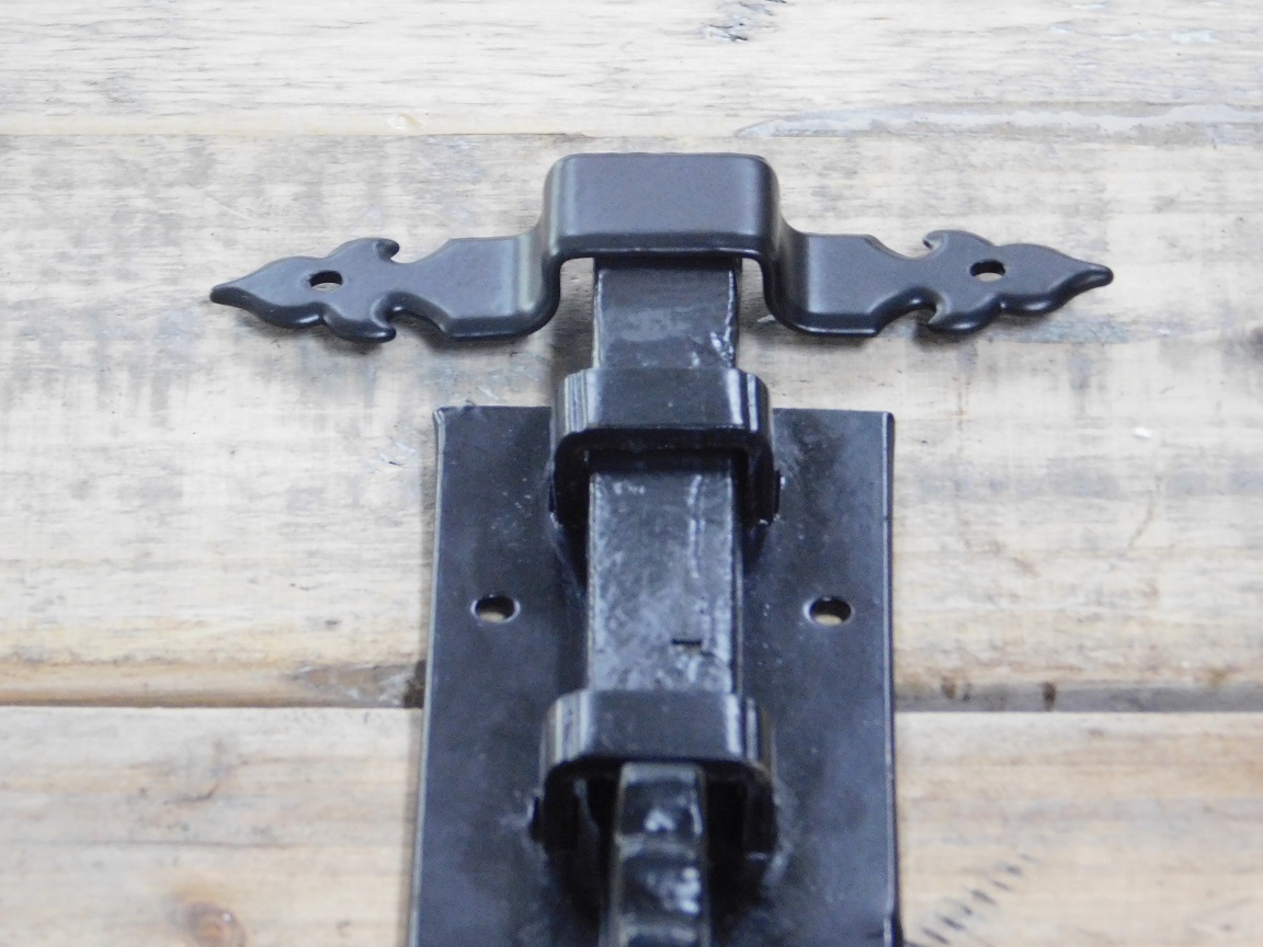 Ein großer, massiver Schiebebolzen für z. B. ein Tor. Hergestellt aus hochwertigem Schmiedeeisen mit einer attraktiven mattschwarzen Oberfläche.