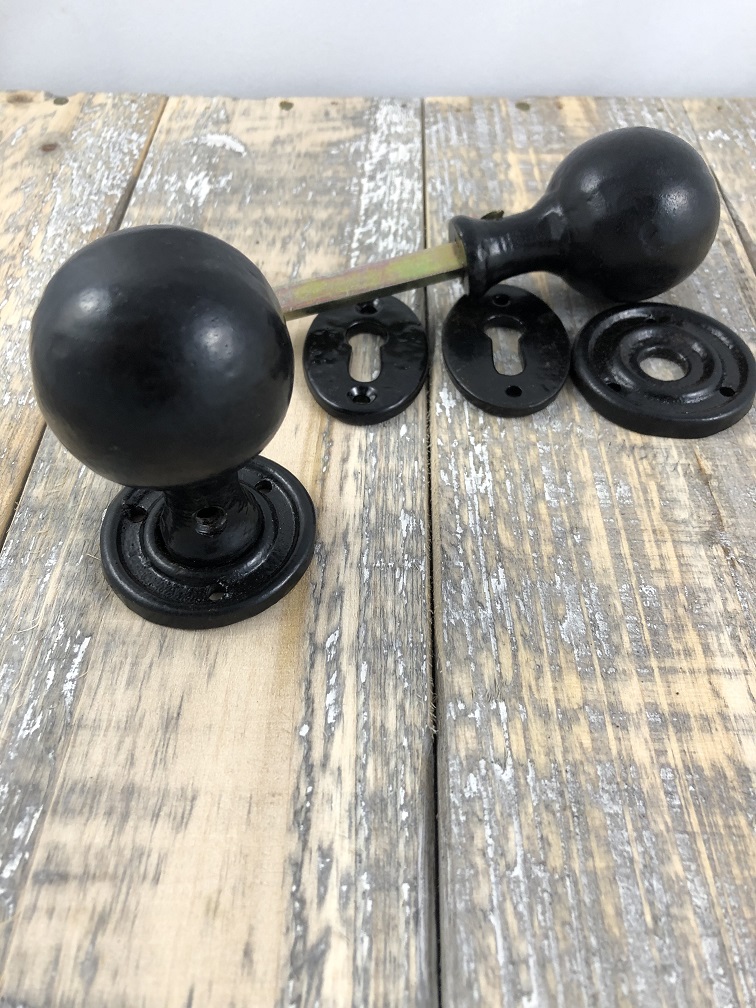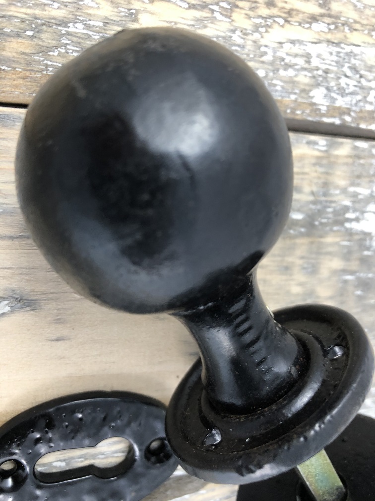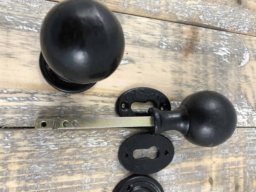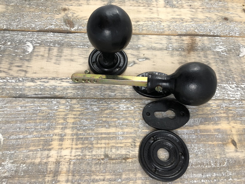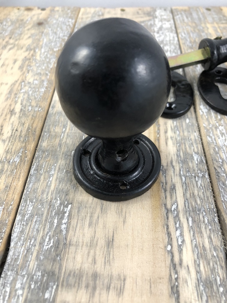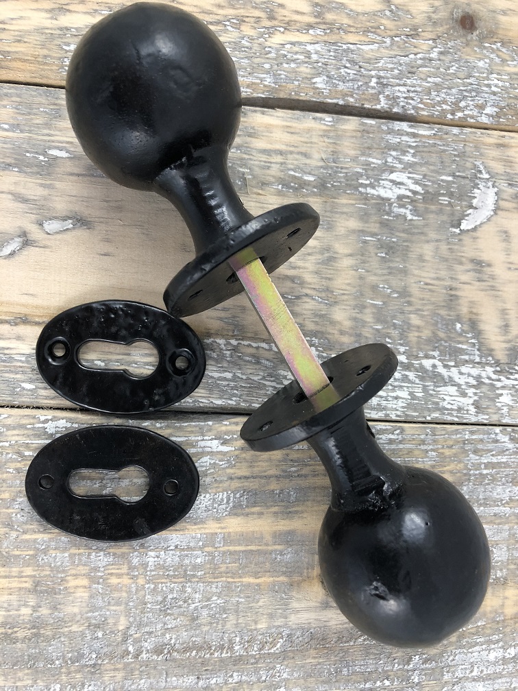 Dieser Tür- oder Torbeschlag ist schön gearbeitet und leicht zu montieren. Die Türknäufe sind aus massivem Metall und daher robust und schwer.