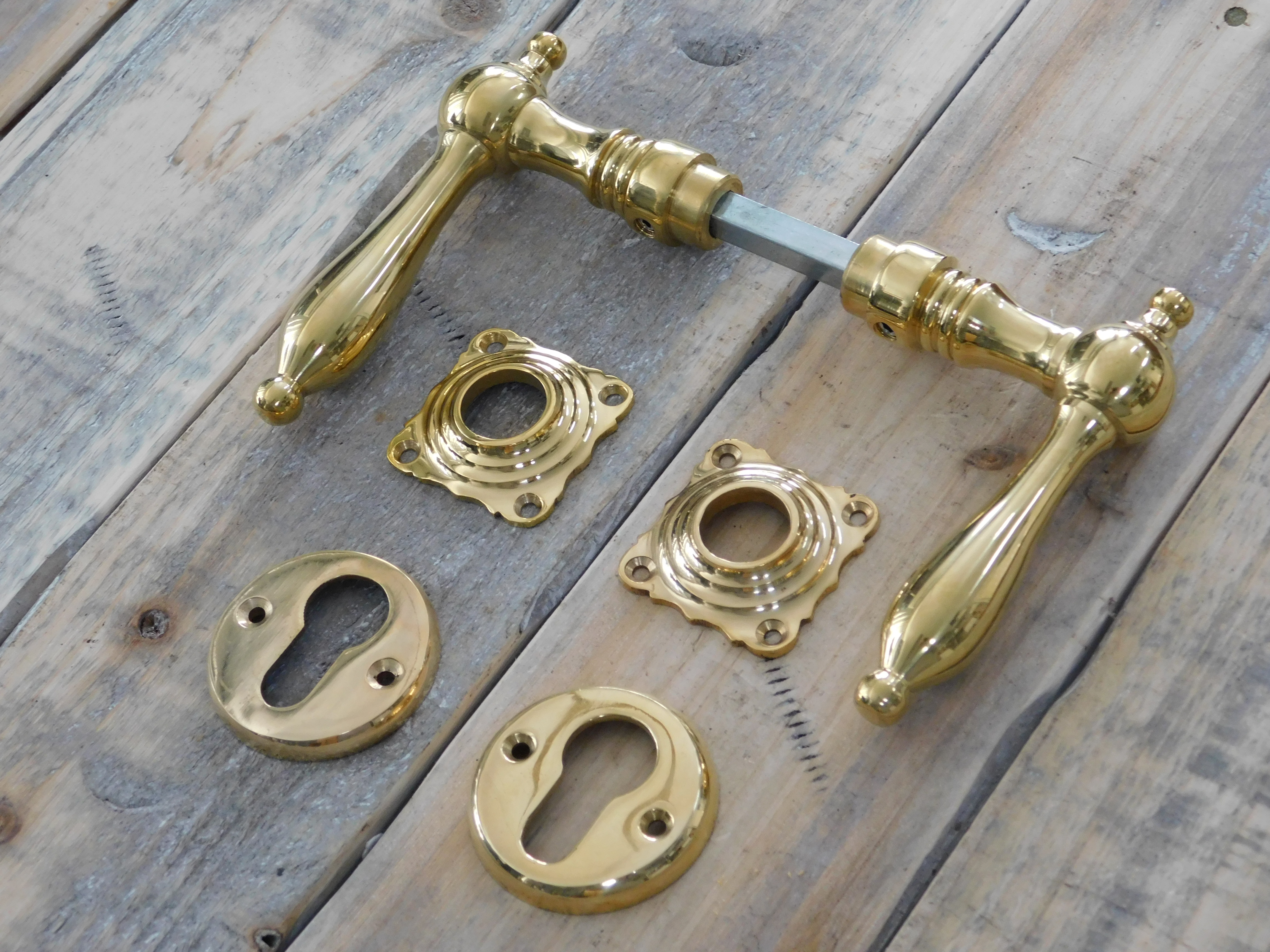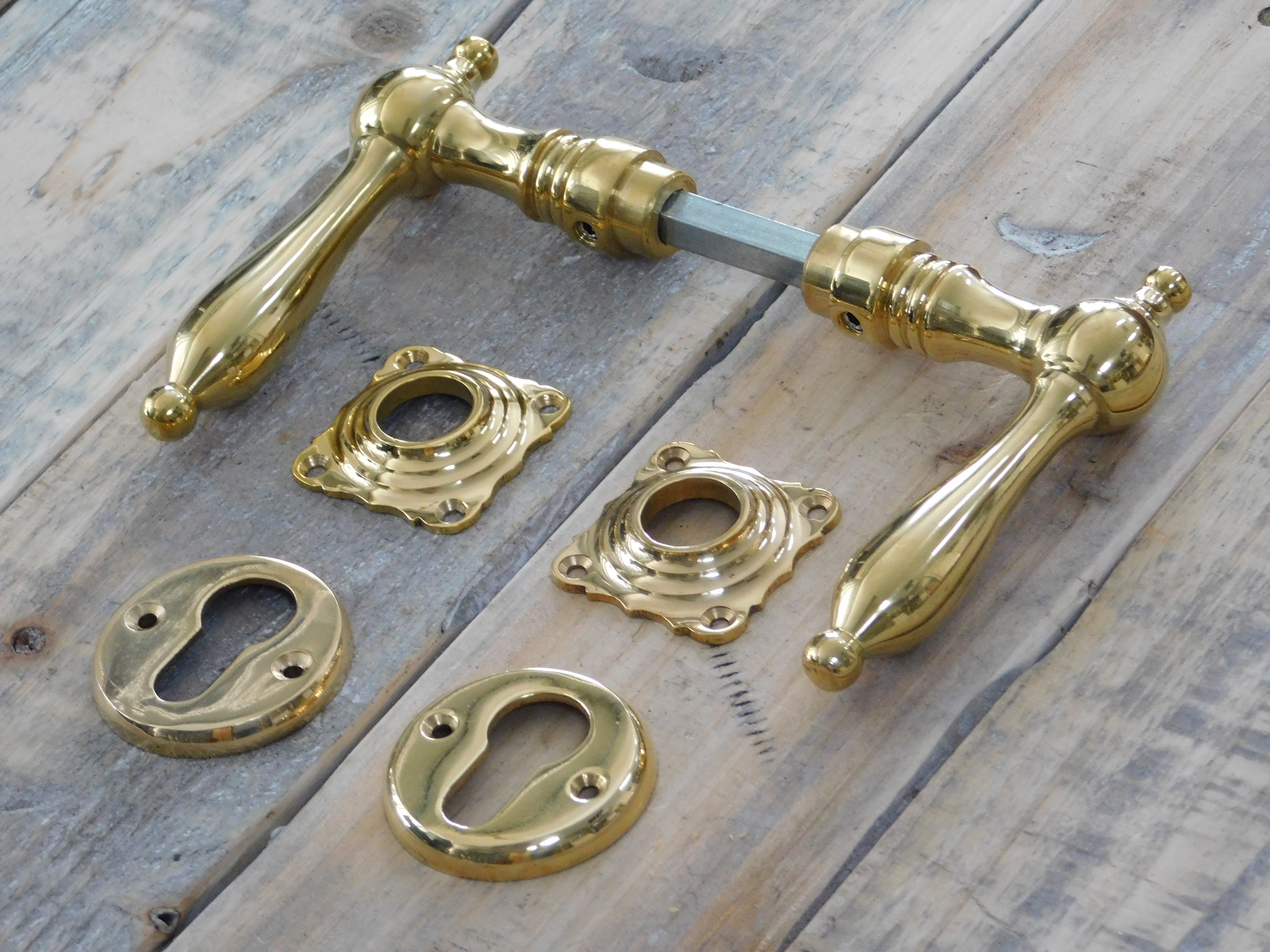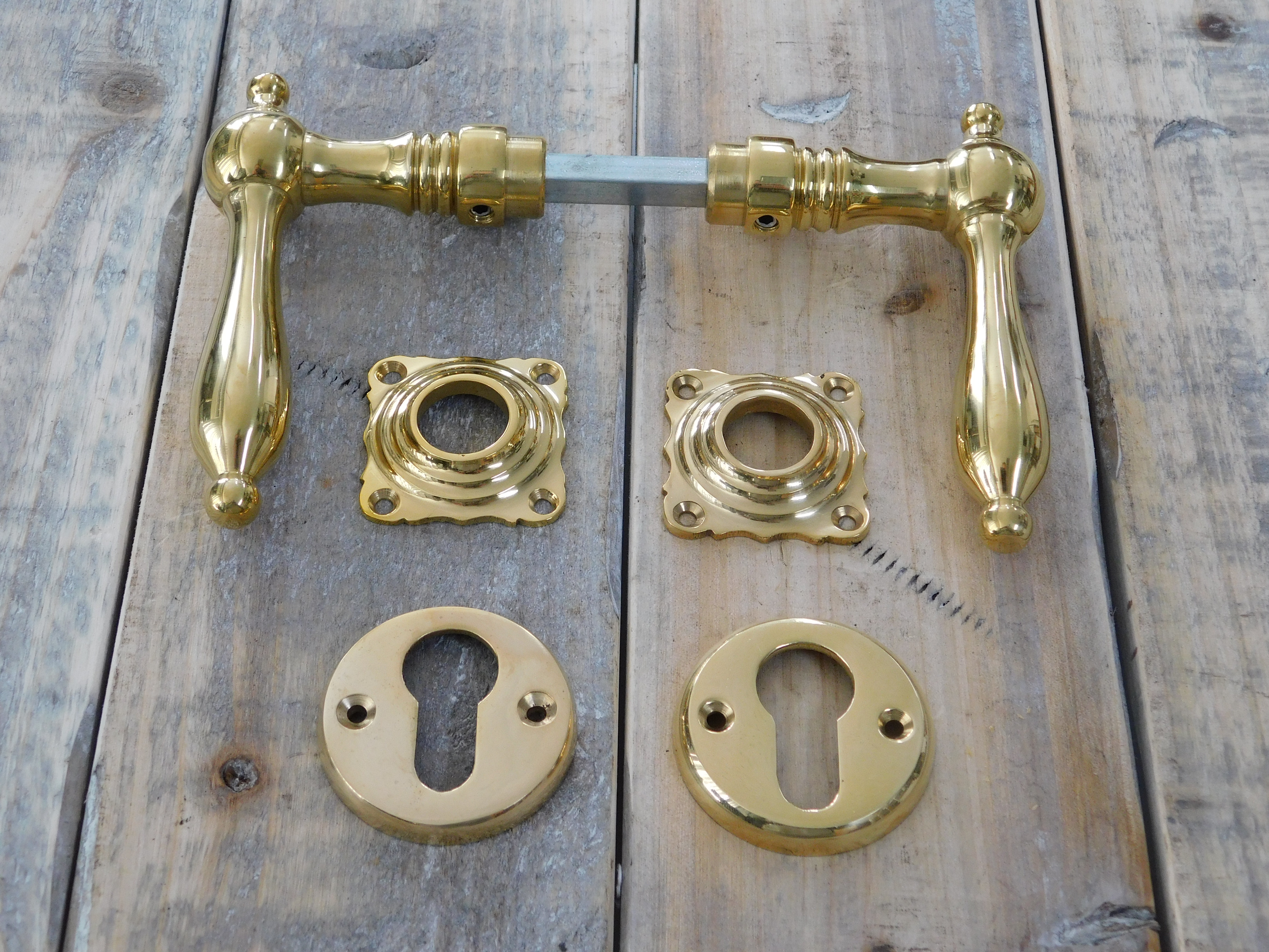 Drückergarnitur mit Griffen und PZ-Schlossrosetten, Türbeschlag Nostalgie für Haustüren, Messing poliert