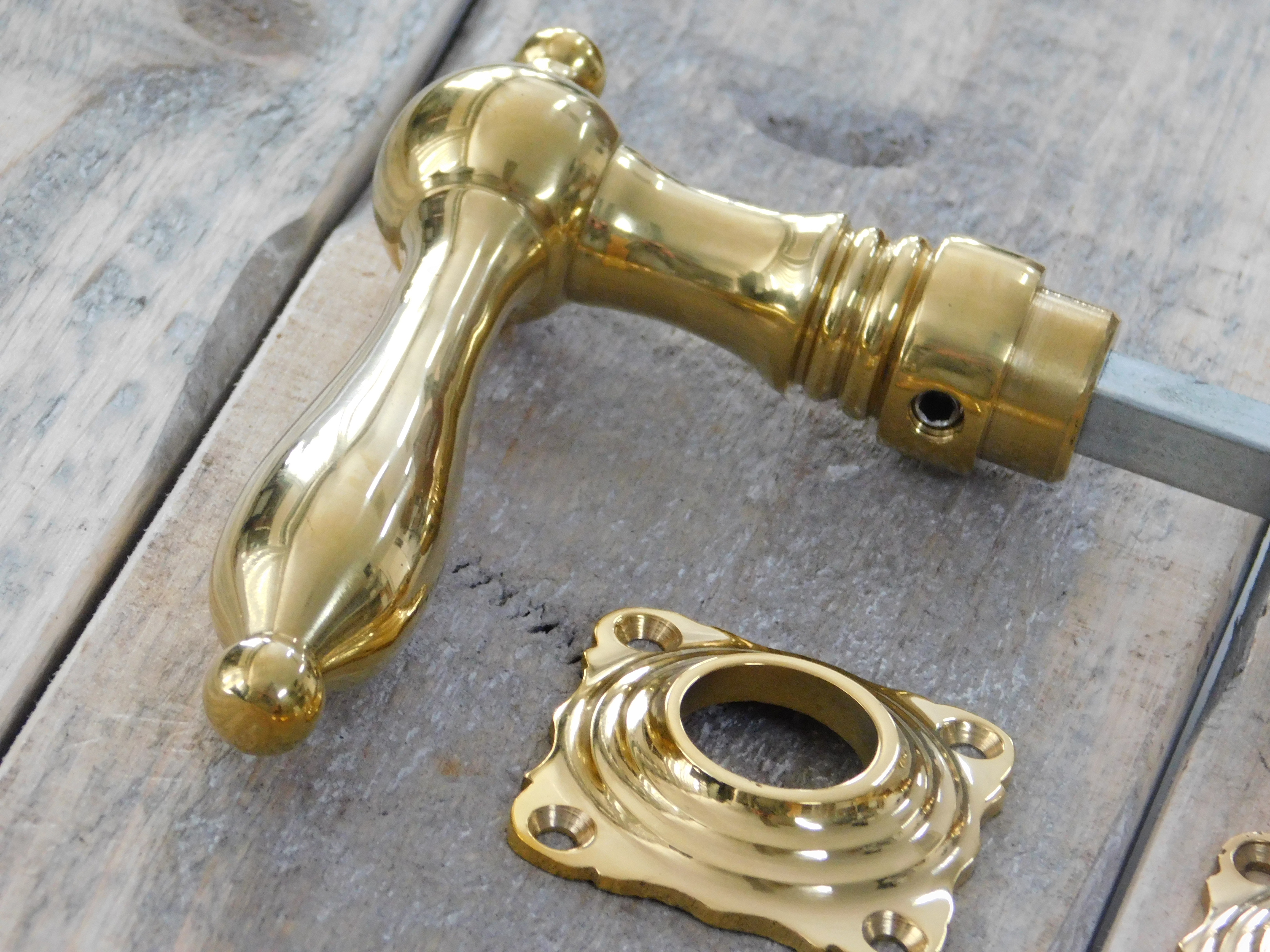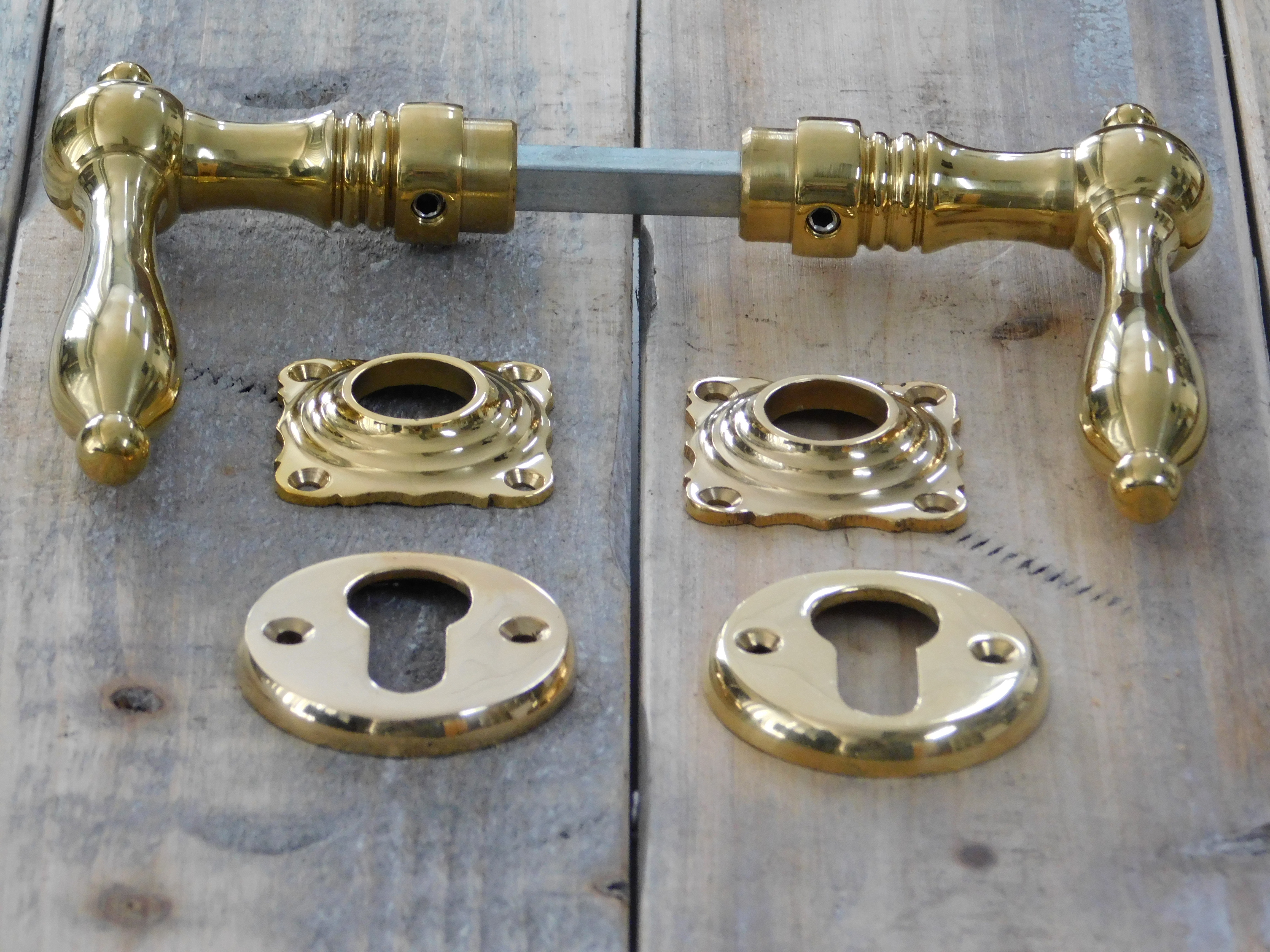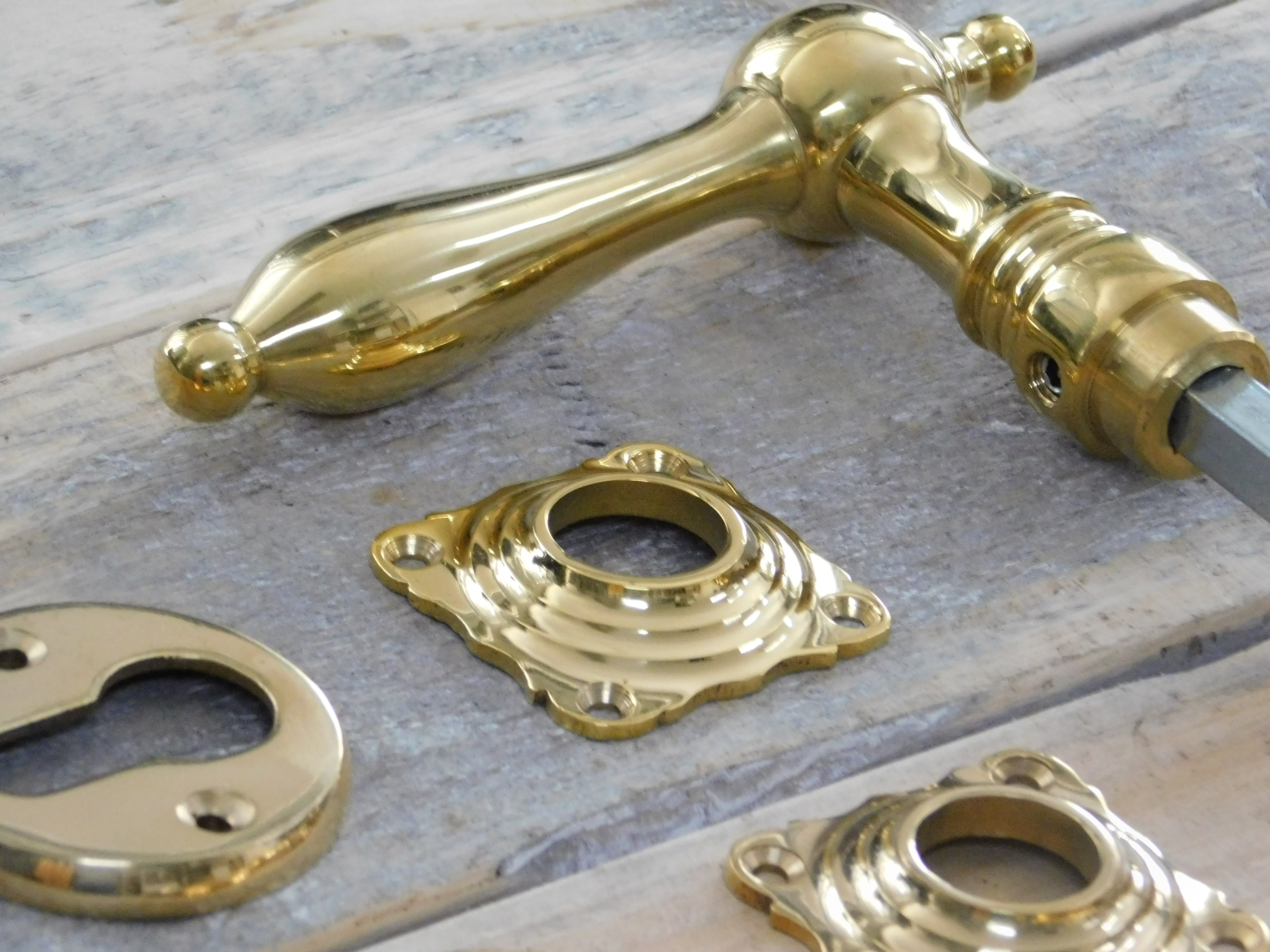 Drückergarnitur mit Griffen und PZ-Schlossrosetten, Türbeschlag Nostalgie für Haustüren, Messing poliert