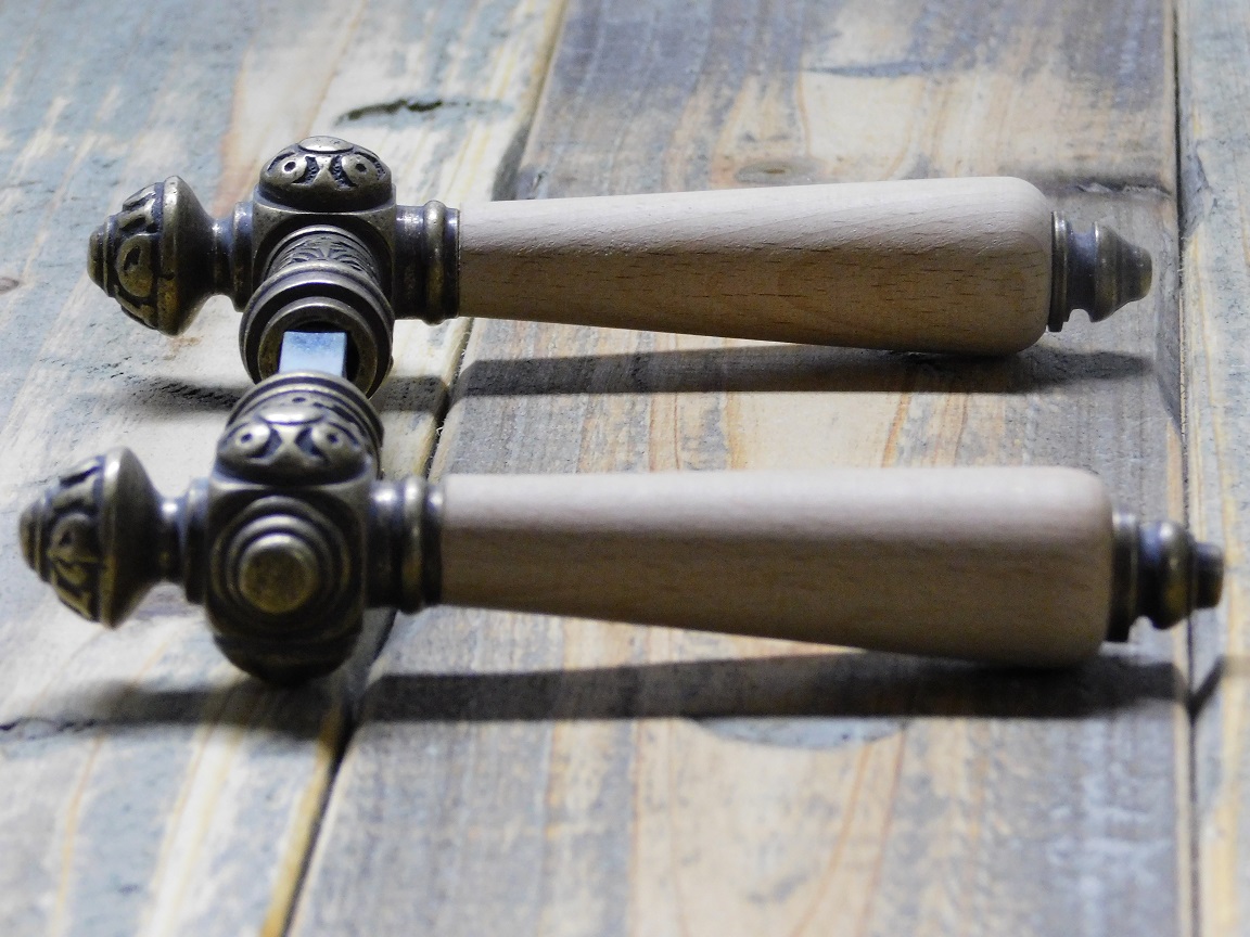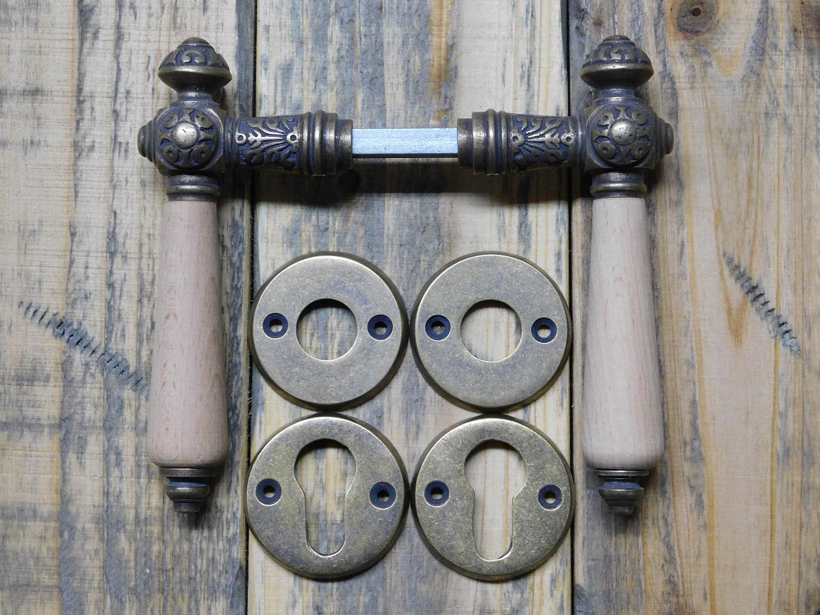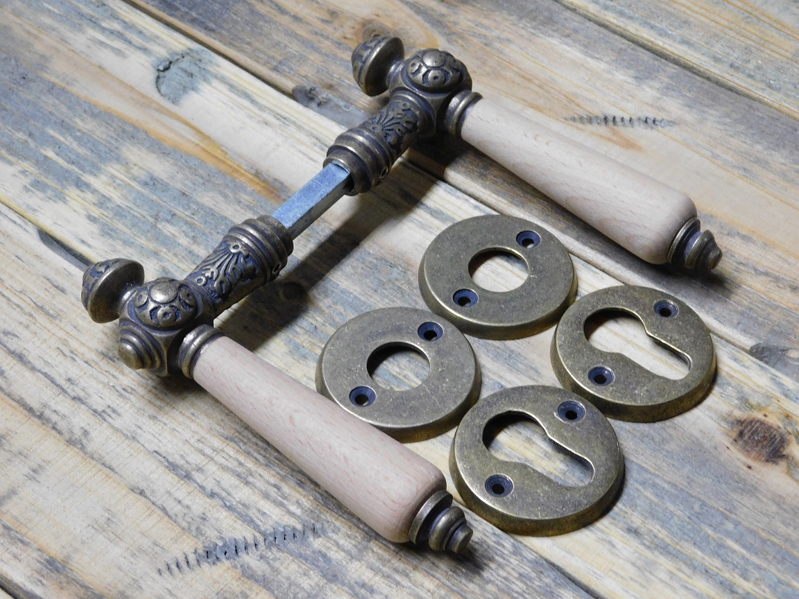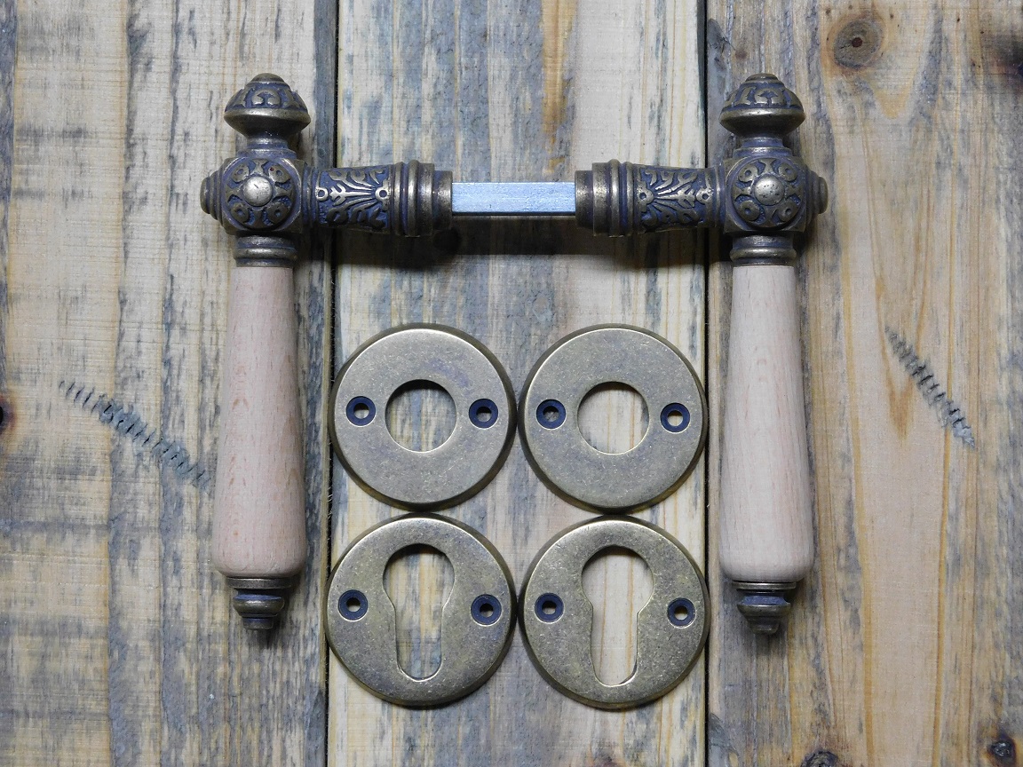 Türbeschlagset - Messing antik mit Holzgriffen - inkl. Rosetten