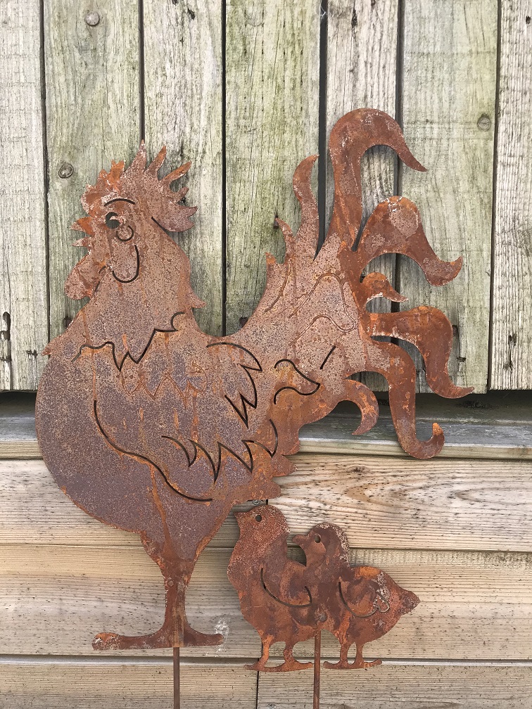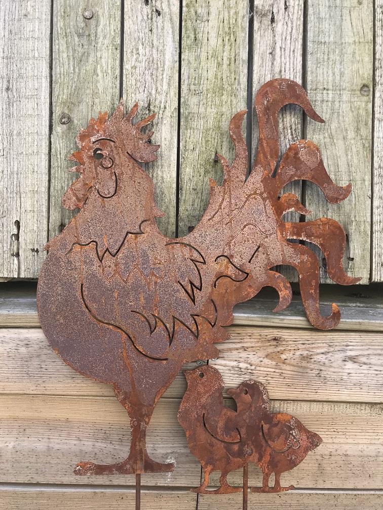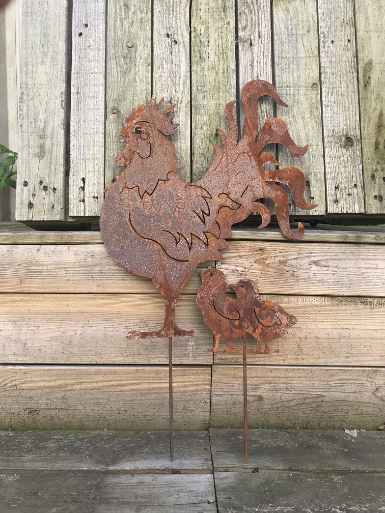 Hübsche Silhouetten eines Hahns und 2 Küken, schön für den Garten, man kann sie einfach irgendwo in die Erde stecken!
