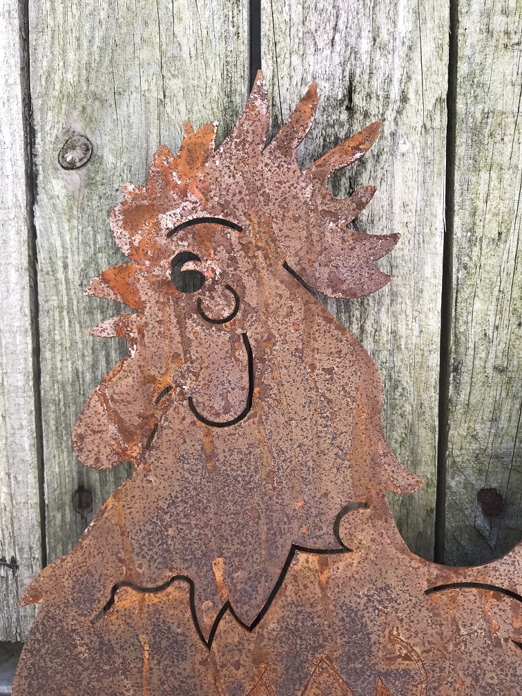Silhouette eines Hahns und seiner 2 Küken, aus Gusseisen-Rost