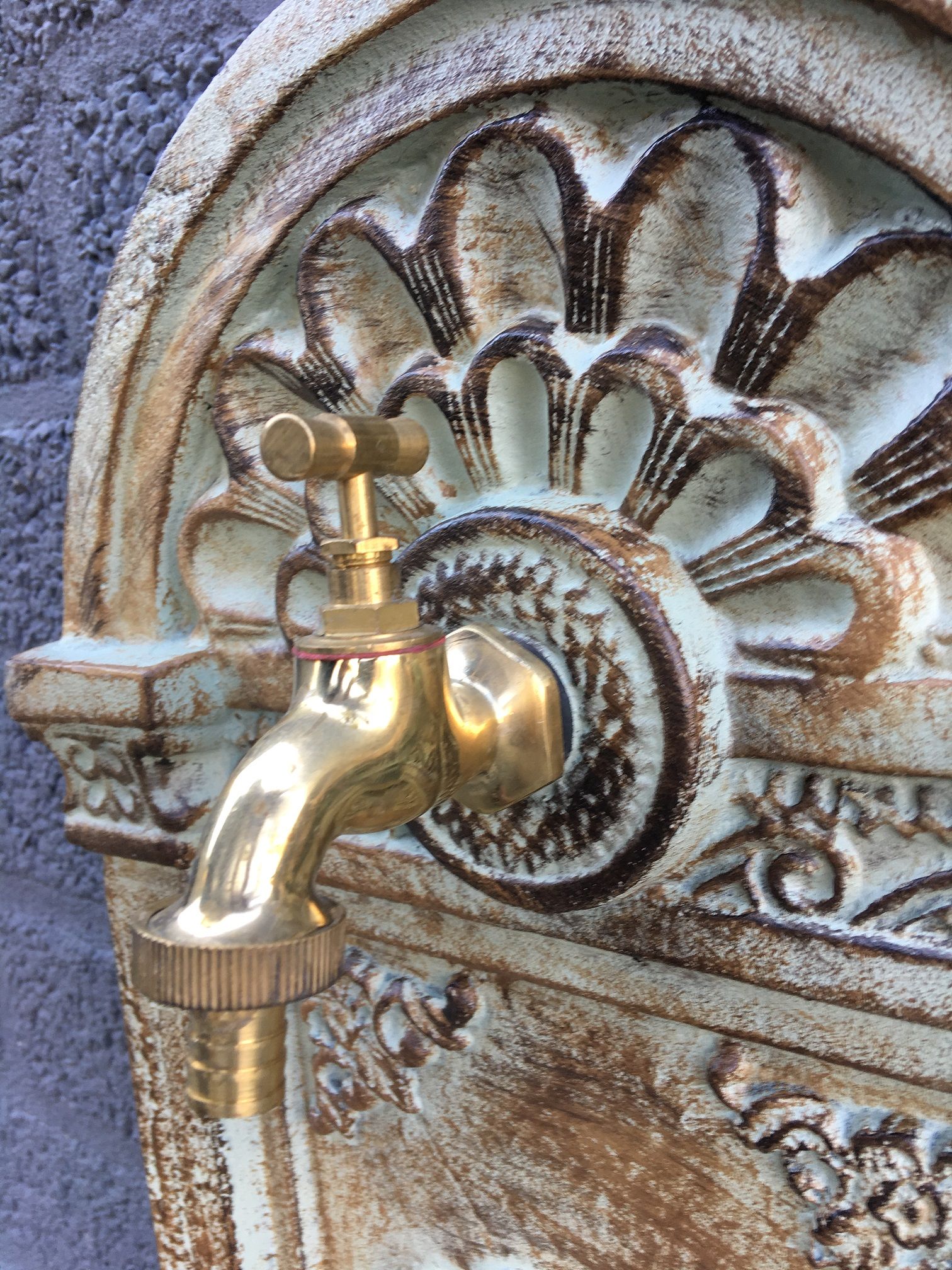 Dieser Standbrunnen wird mit einem dekorativen Messinghahn geliefert. Der Wasserhahn wird einfach mit einer Flachmutter an der Rückseite befestigt. Am Gewinde des Wasserhahns können Sie dann einen Wasserschlauch mit einer Schlauchschelle befestigen oder ihn mit einem Eisenstutzen an die Wasserleitung anschließen.