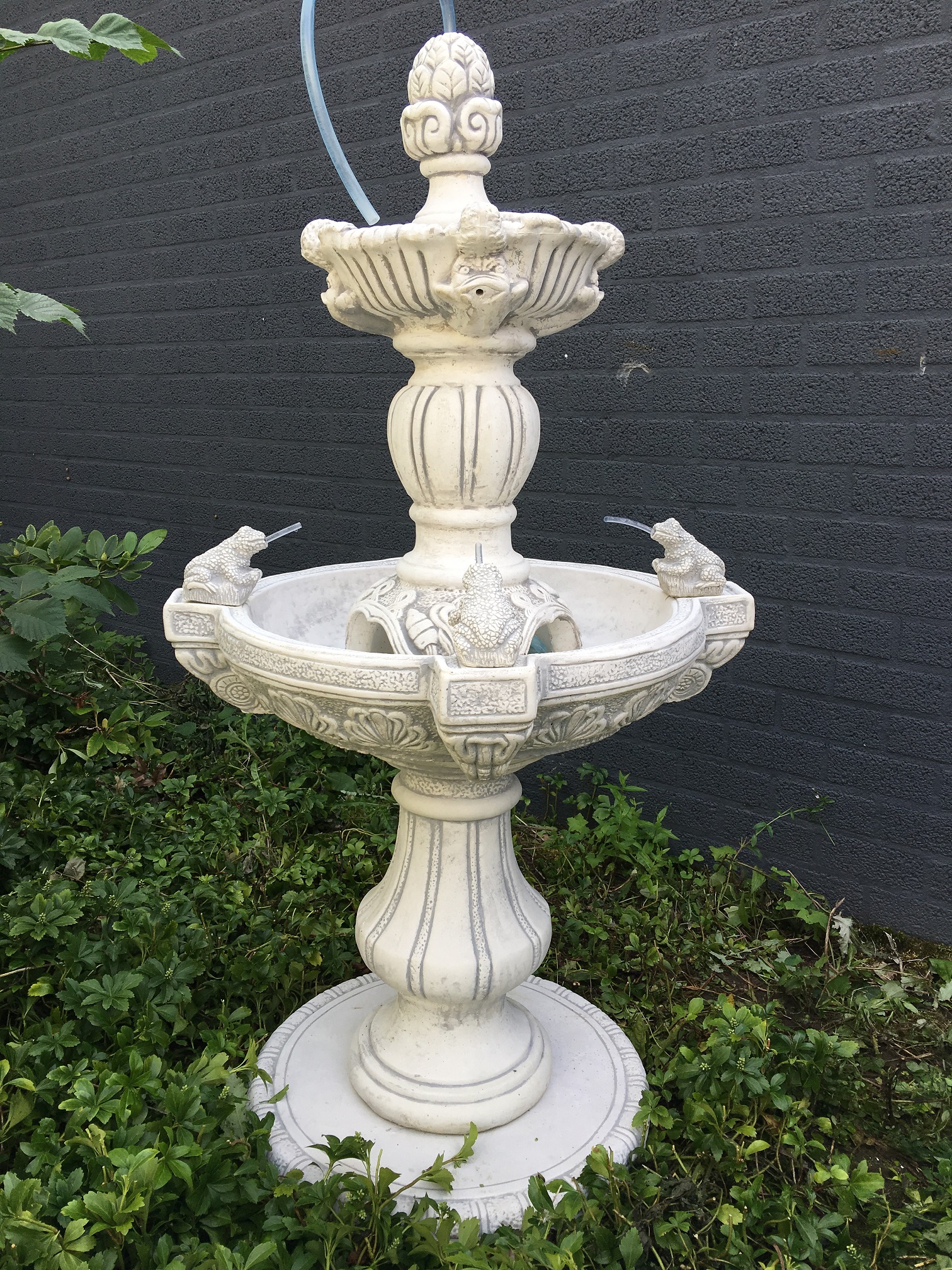 Gartenbrunnen mit spuckenden Fröschen, voll aus Stein.
