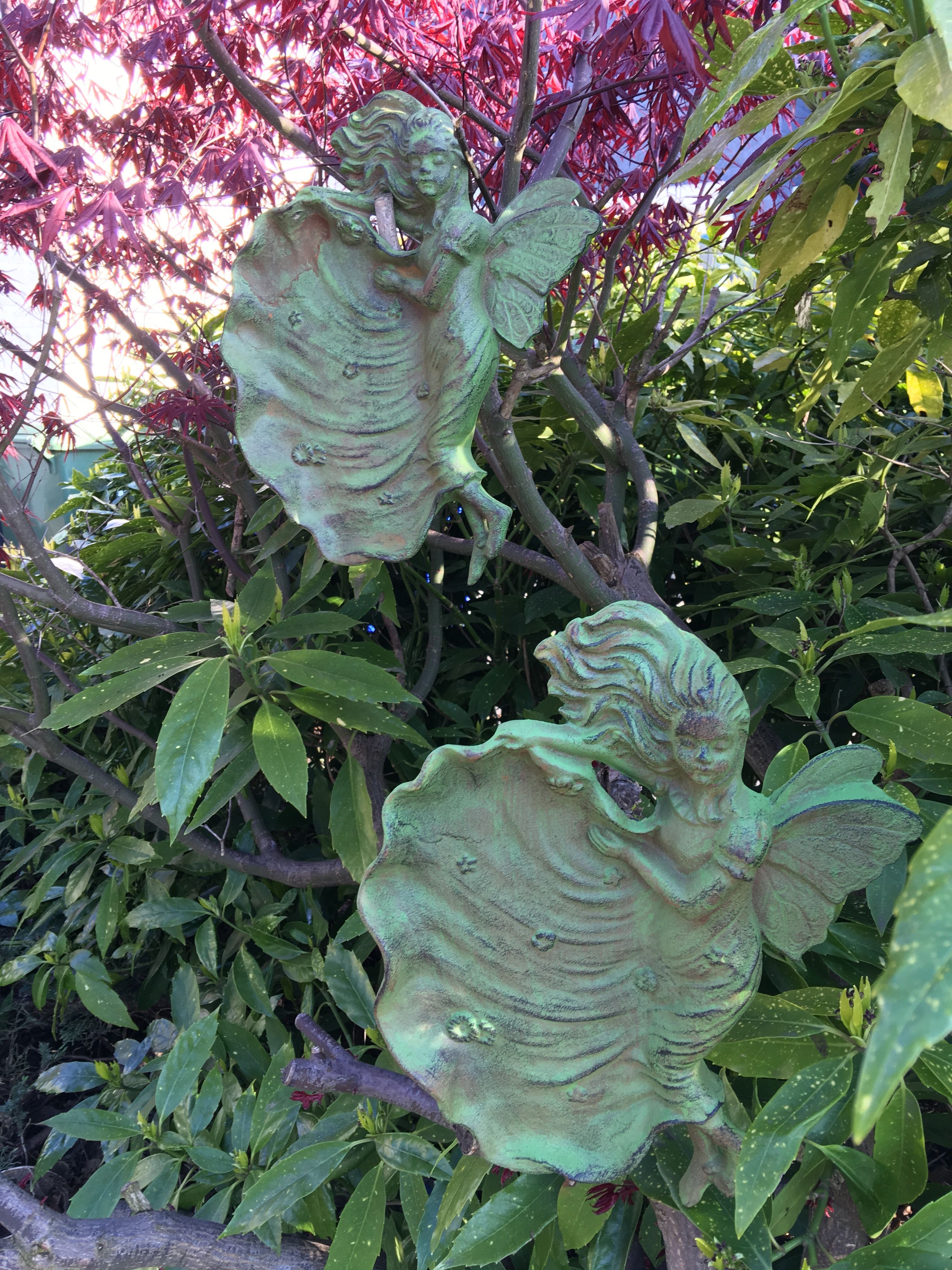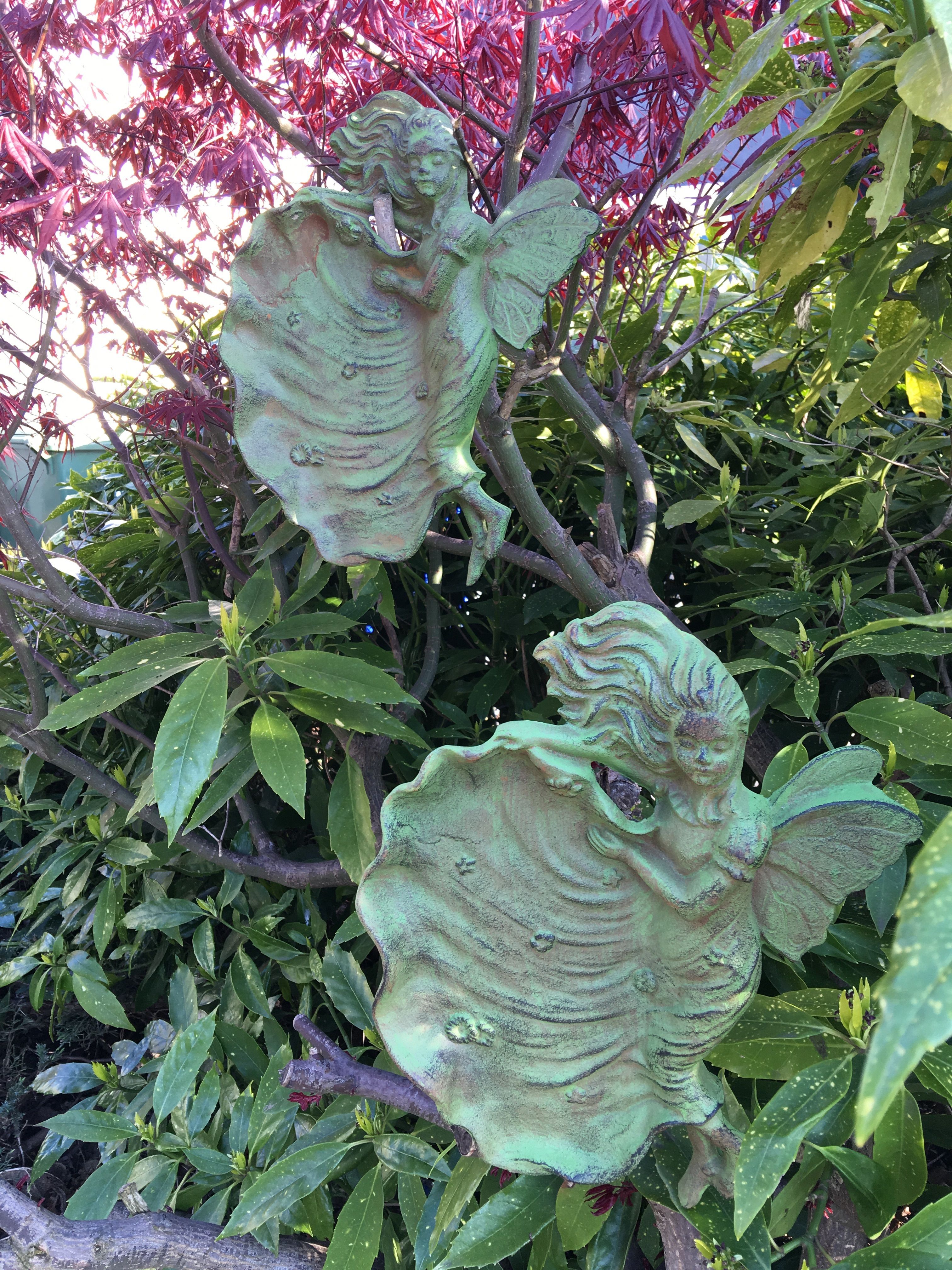 Wandornament / vogelbad engel, gietijzer groen.