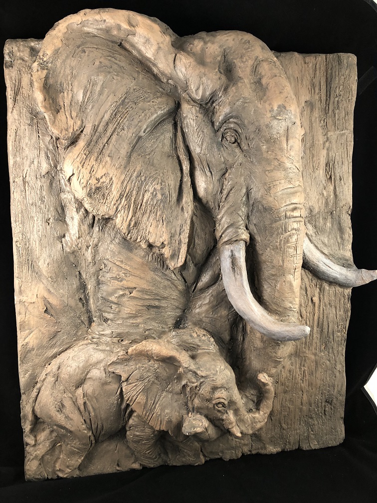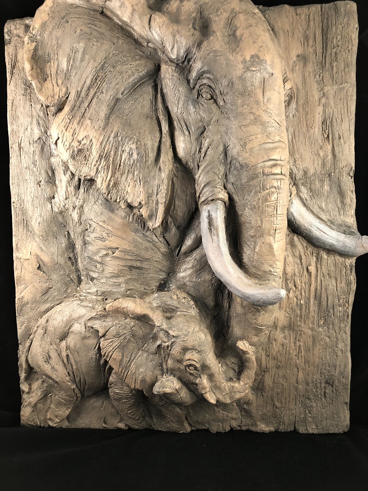 Wanddekoration in Holzoptik mit 3 D Abbildung von 2 Elefanten, Polystone-Holz