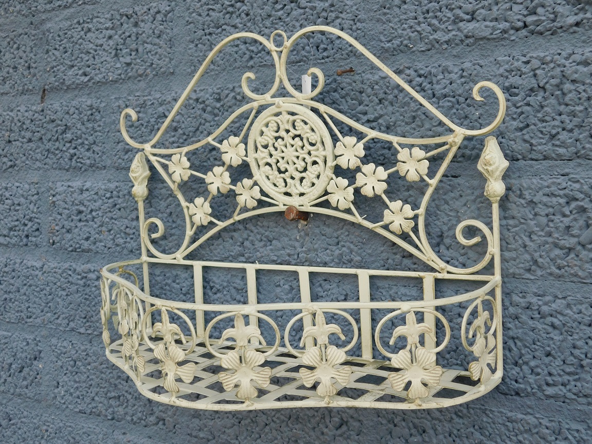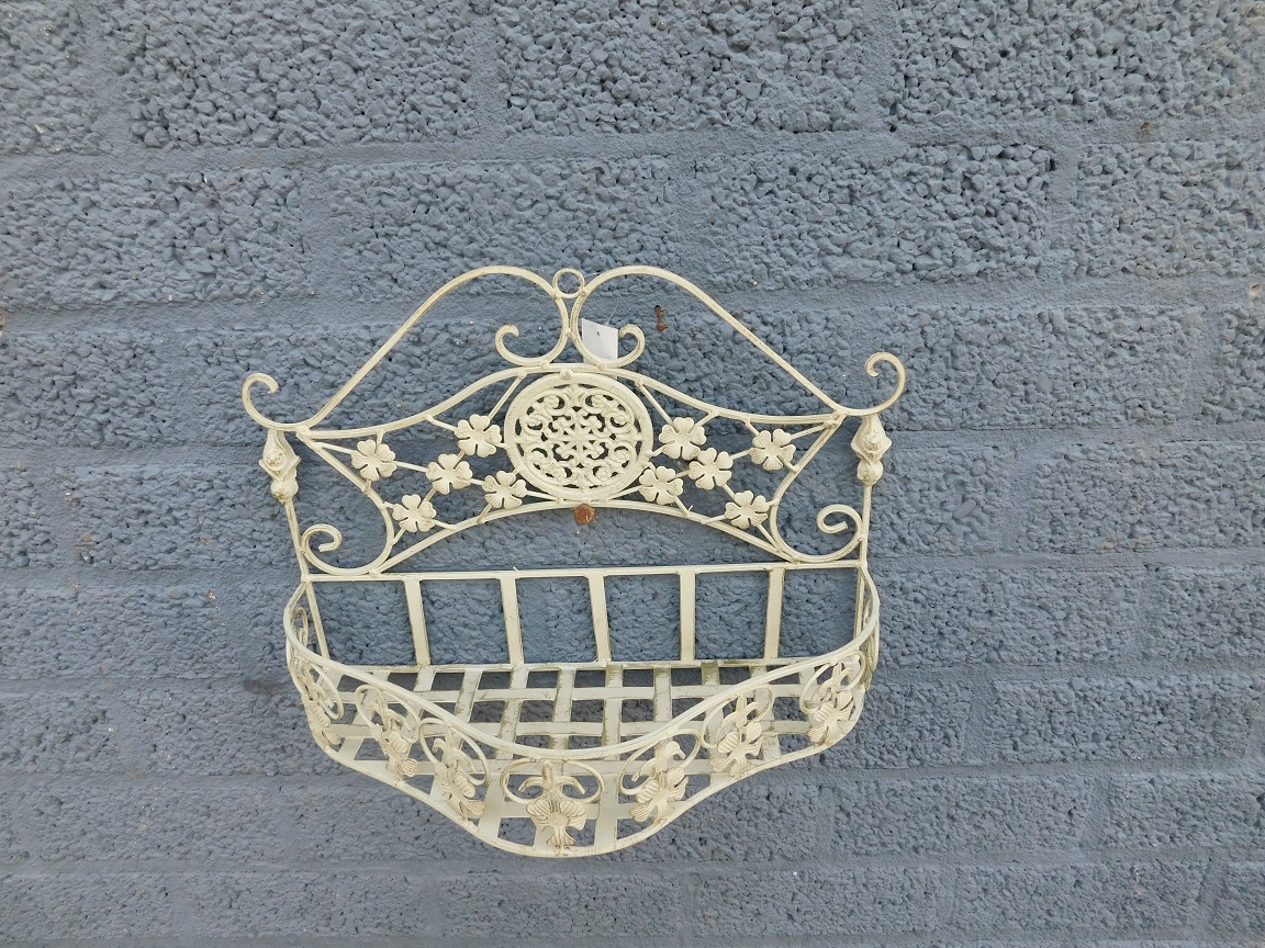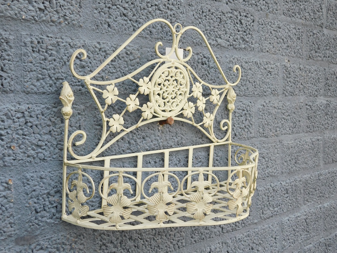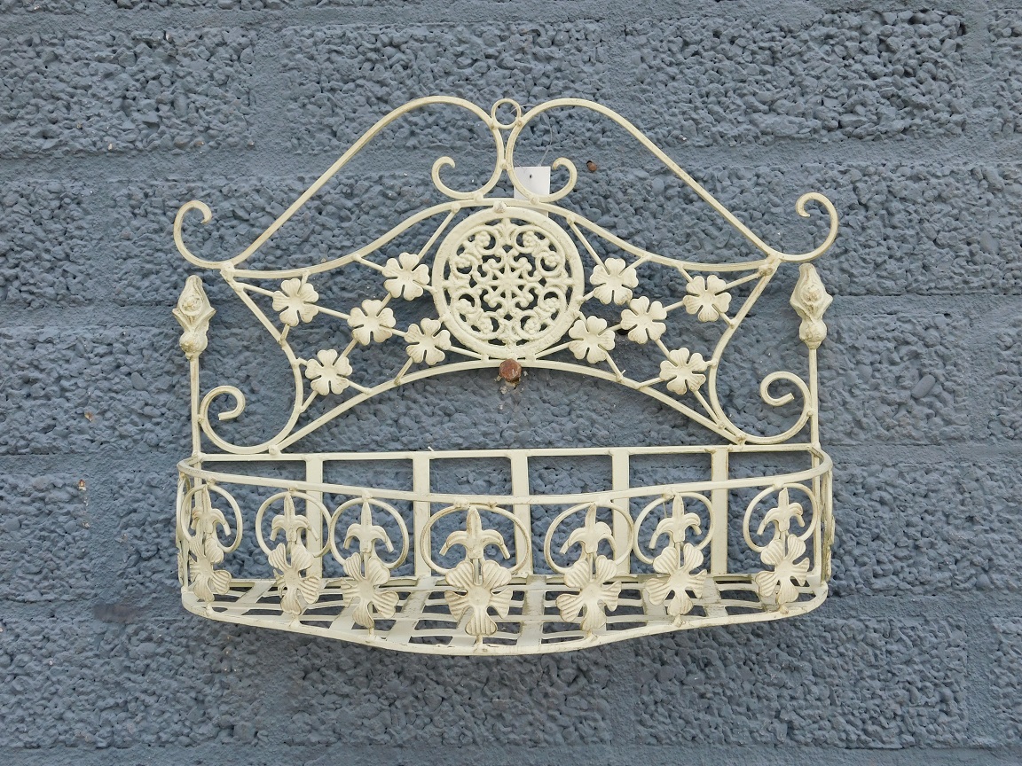 Hier erhalten Sie ein schmiedeeisernes Wandregal im antiken Stil in der Farbe Off White lackiert.