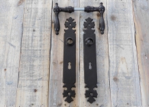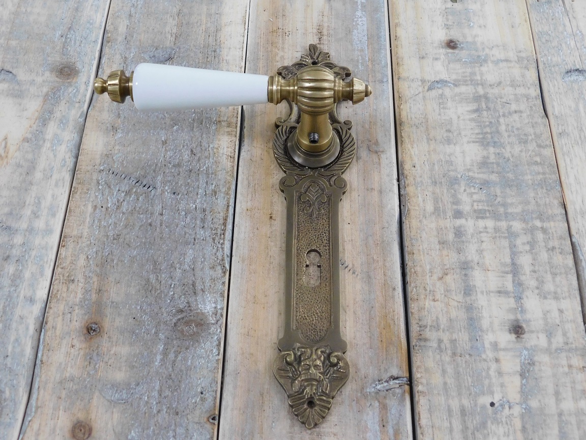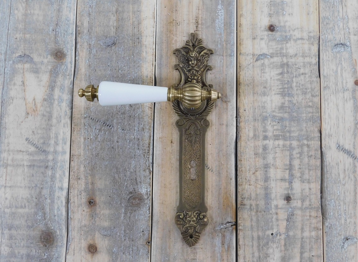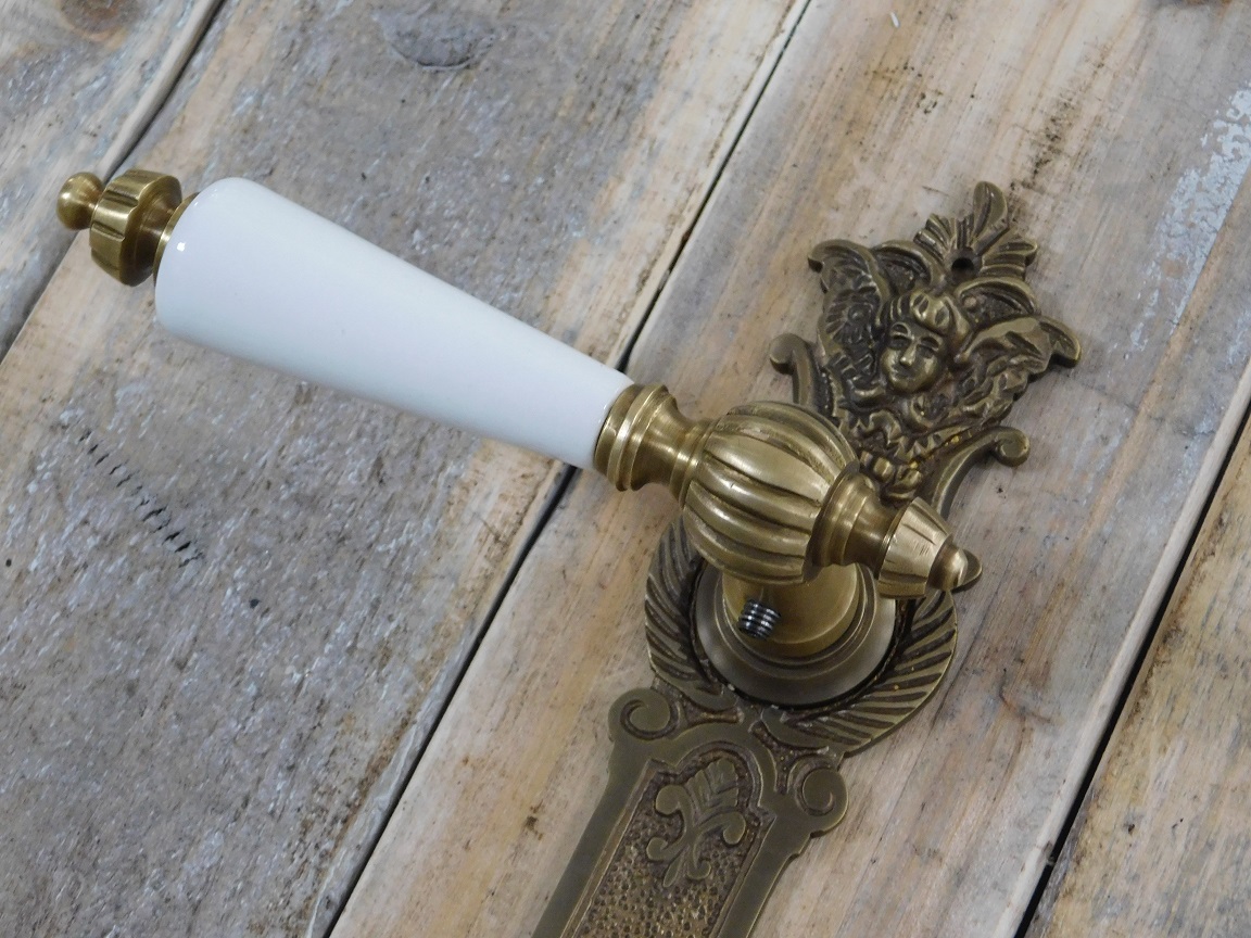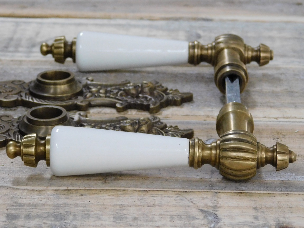 tags: antike Beschläge, Messing, Barocker Türbeschlag, antike Messing-Beschläge, Drücker-Garnitur Jugendstil, Türverschluss Barock, Klinken-Garnitur für antike Tür, Türbeschlag mit Keramikgriff,
