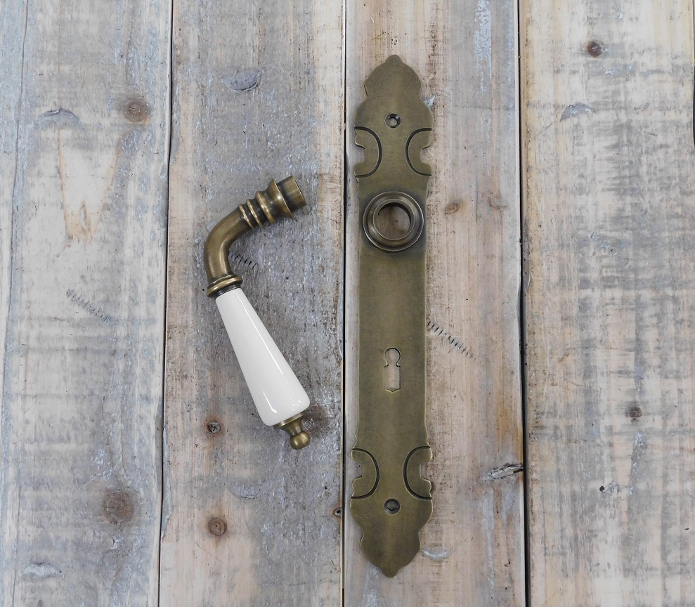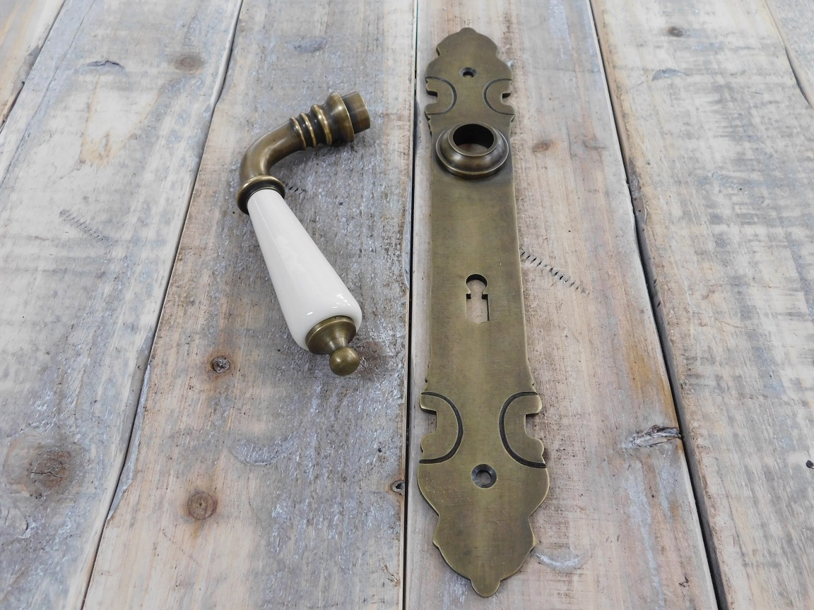 Deurknoppen gepatineerd messing met keramische handvat antiek wit, lange plaat BB 72