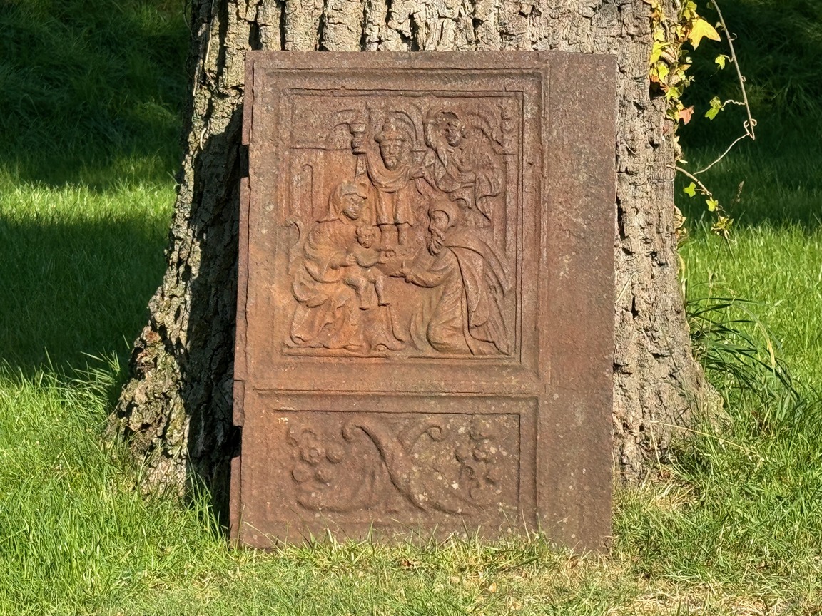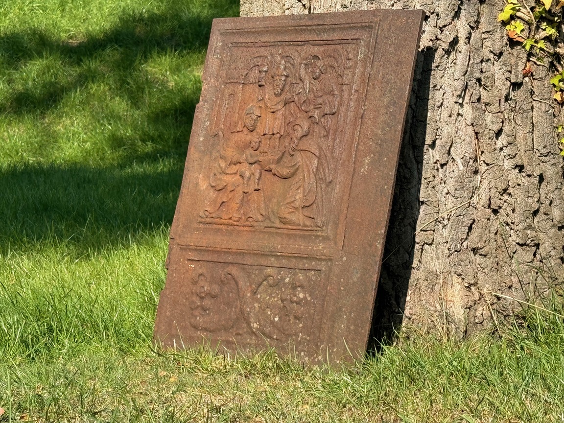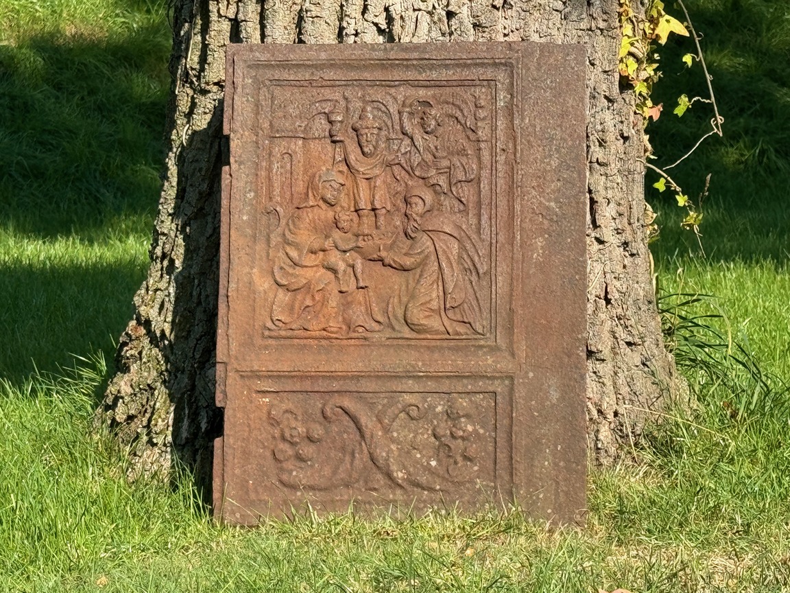 Antique hearth plate, large, old scene, vintage cast iron, rustic.