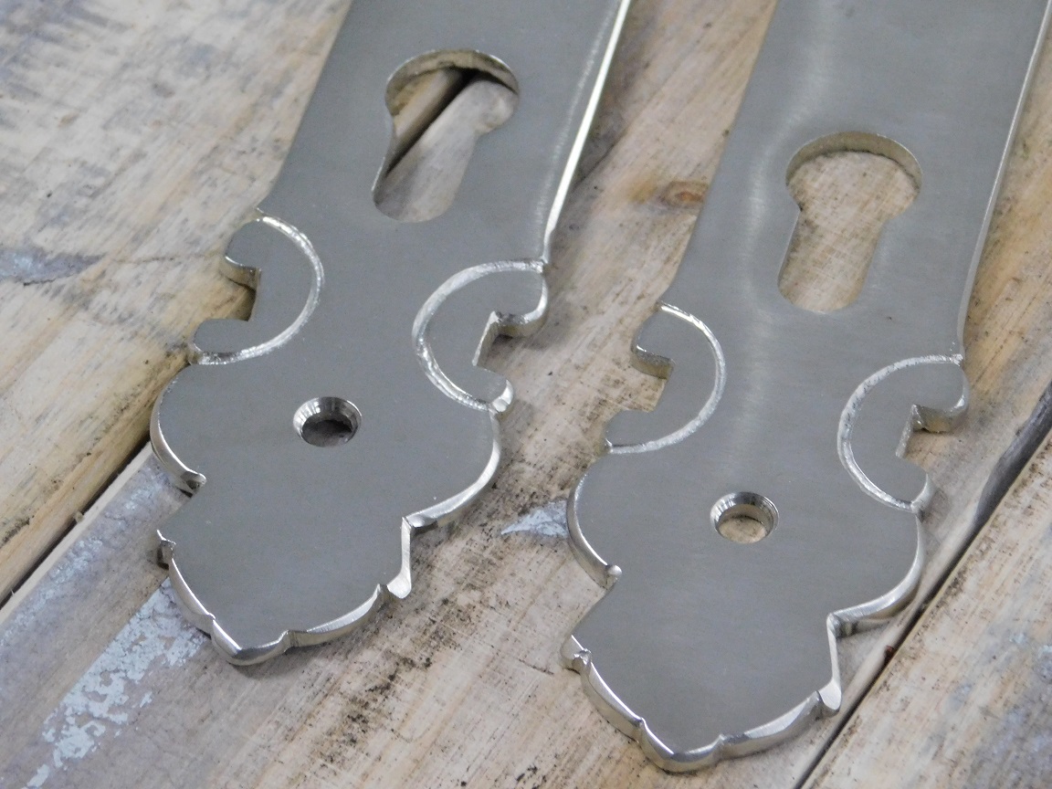 Beautiful set of door hardware, matt nickel, consisting of two door handles, two long door plates and a door pin. The door handles feature porcelain handles.
