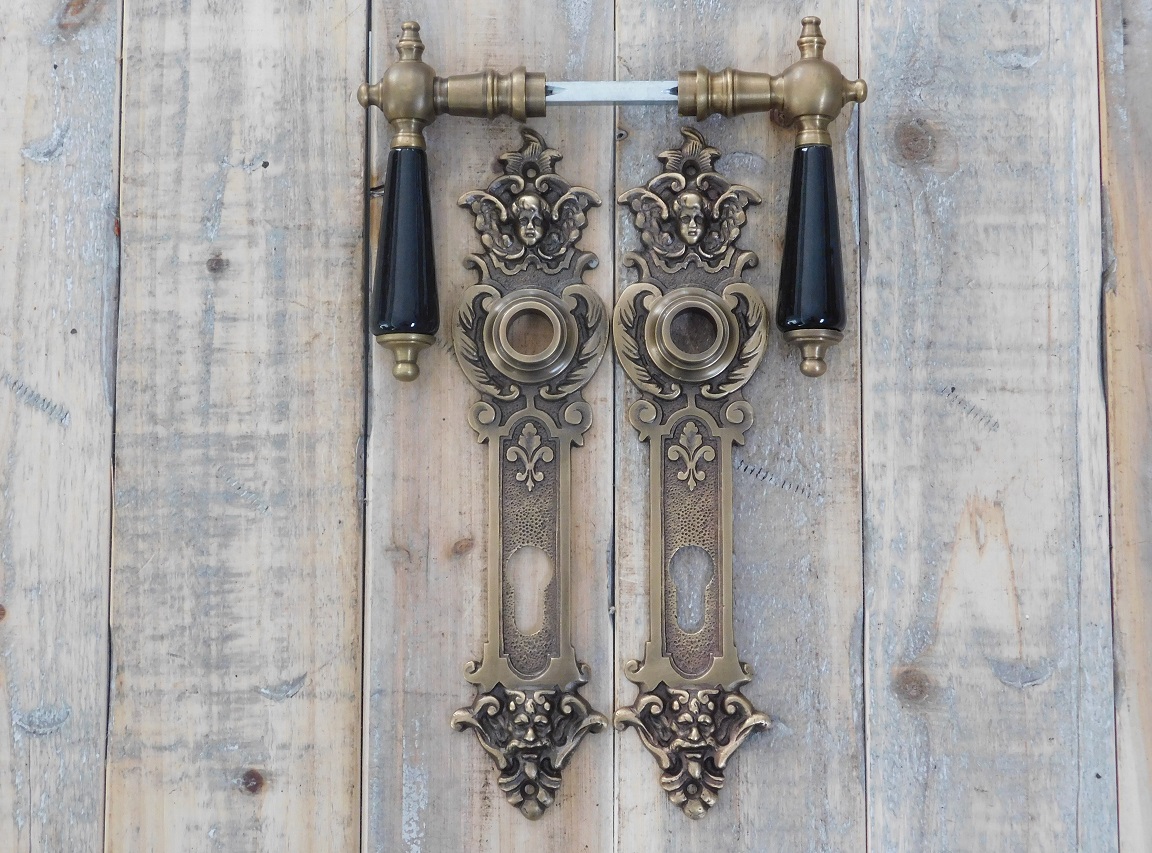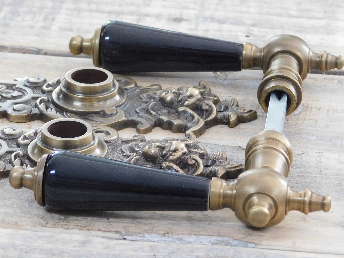 Alternate products for Set deurbeslag: messing, antiek- deurplaten zeer decoratief met engelen - klinken met zwart porseleinen grepen.