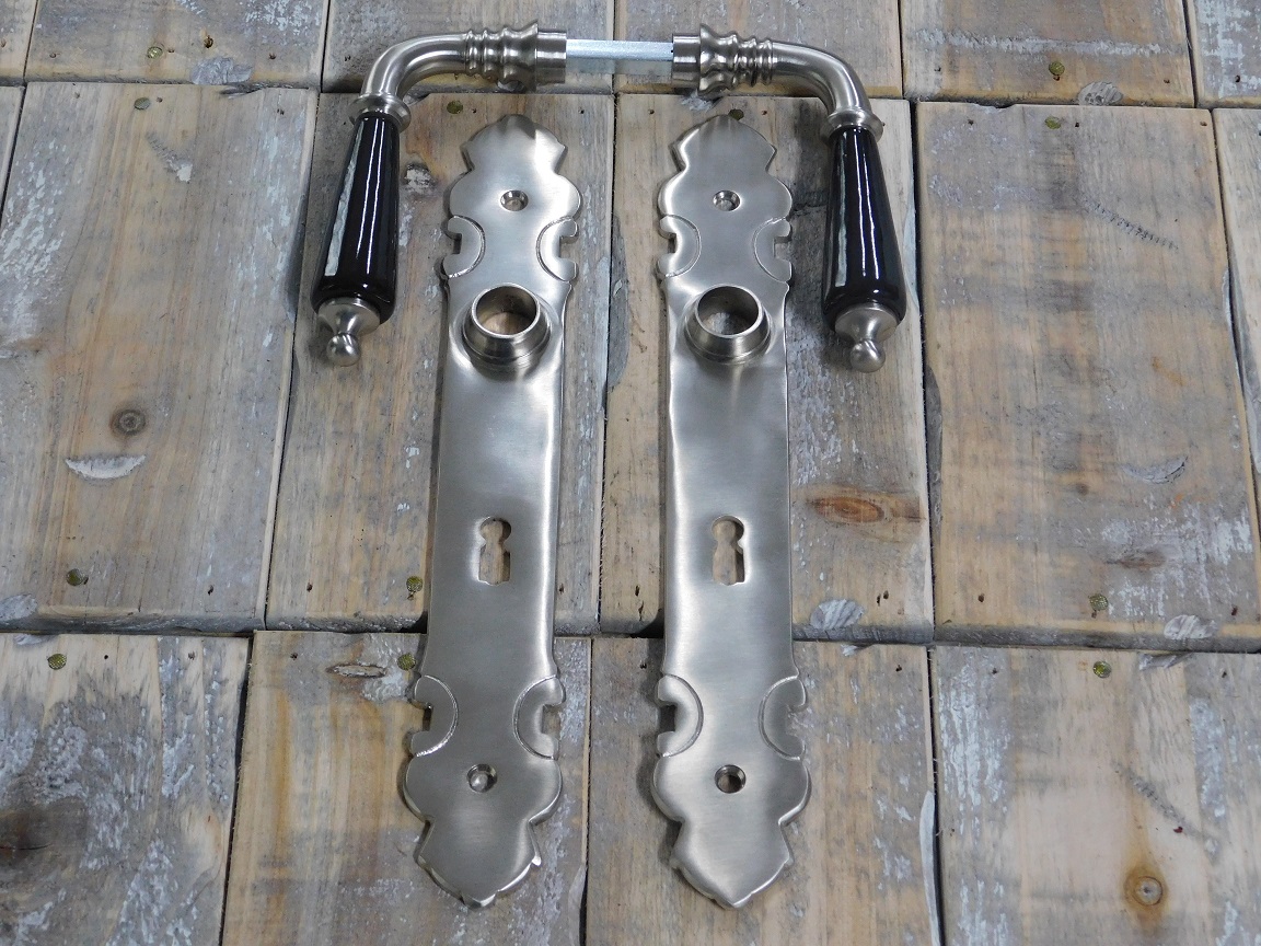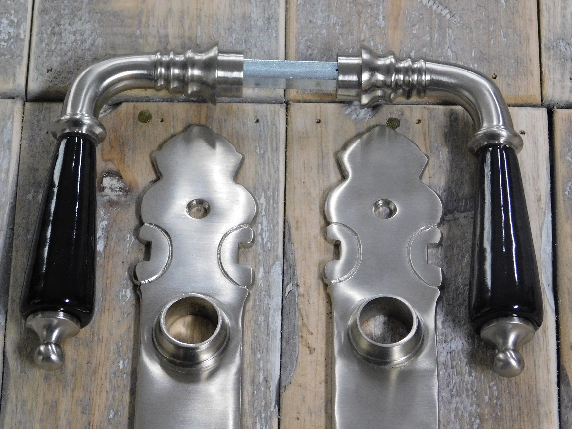 Beautiful set of door hardware BB72 - made entirely of brushed nickel and fitted with black porcelain handles.