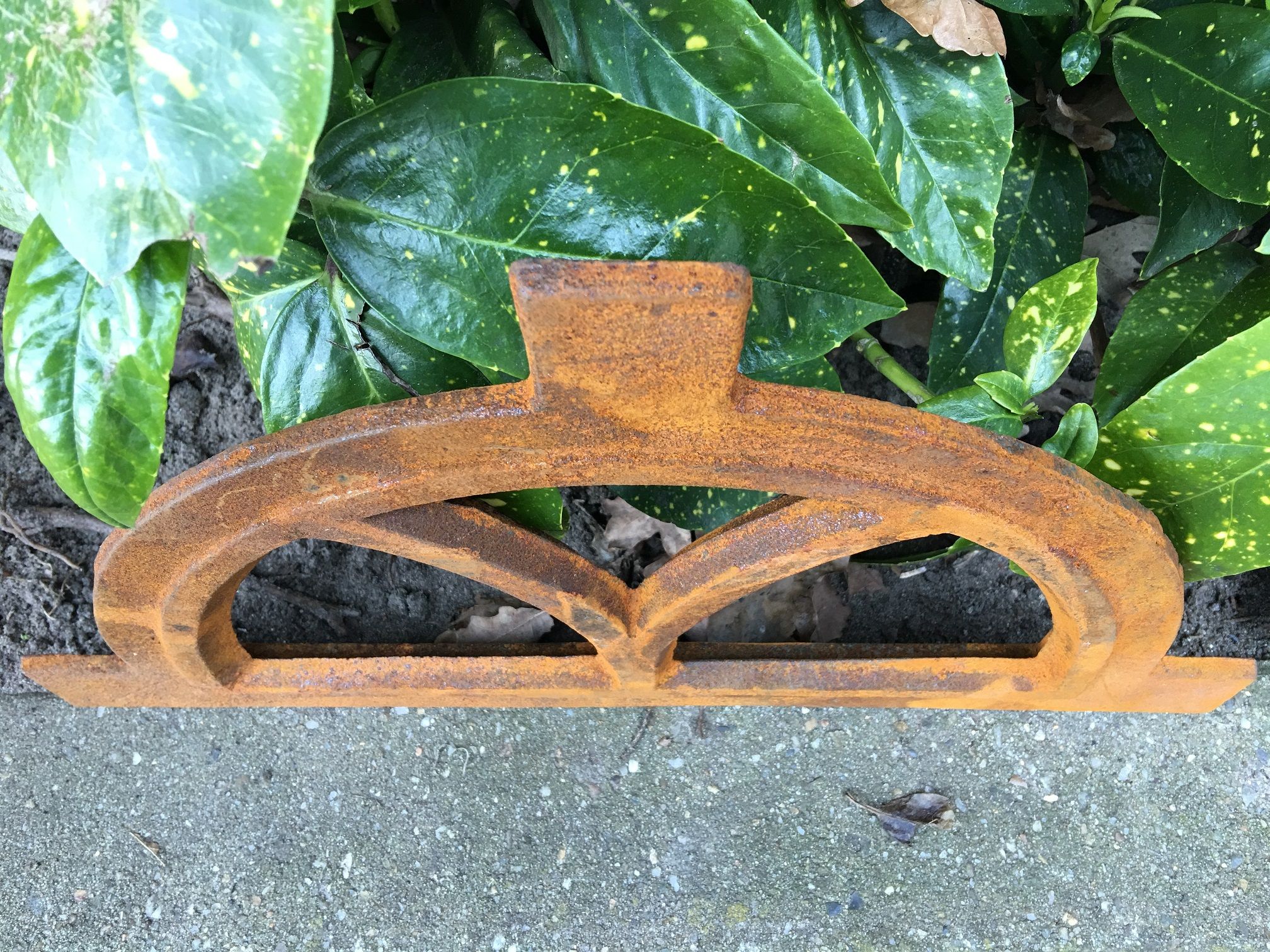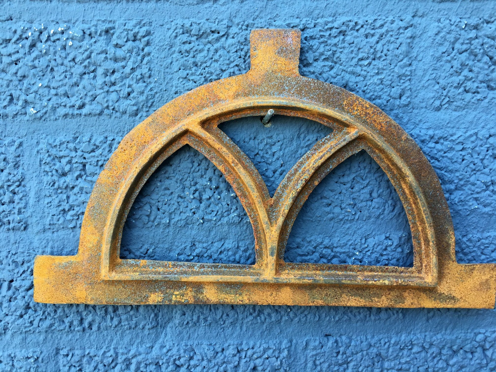 An original small cast iron window in an appealing shape with a harmonious V shape.