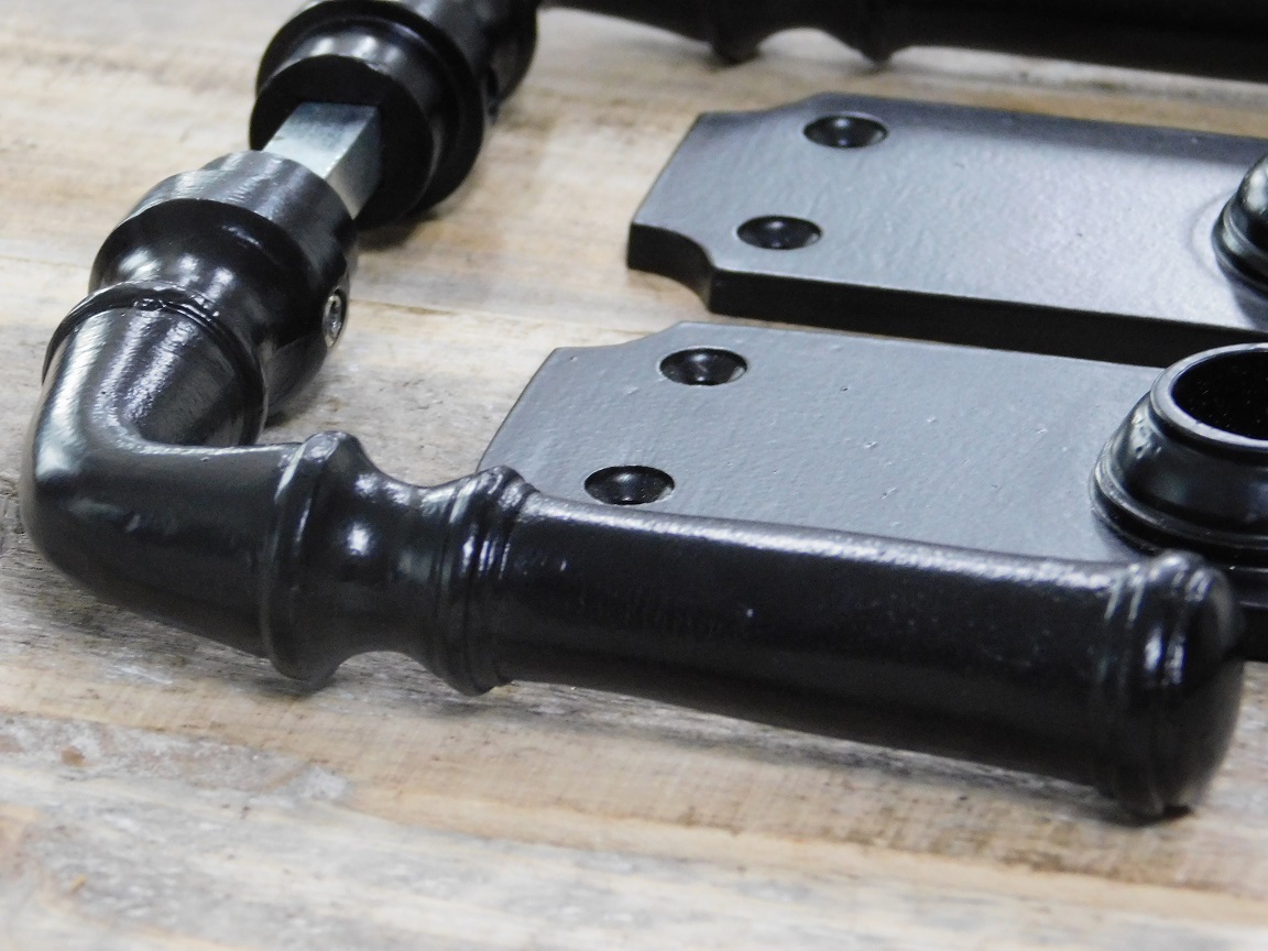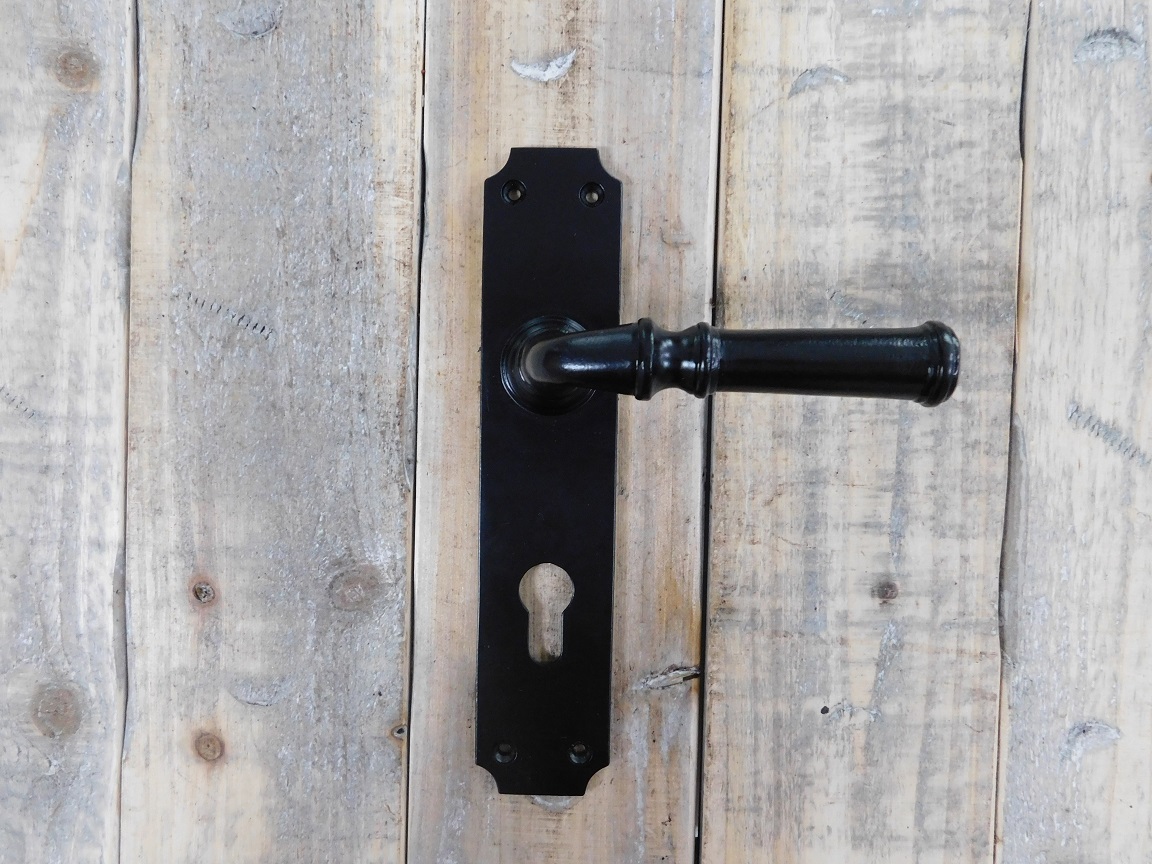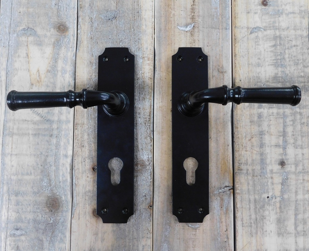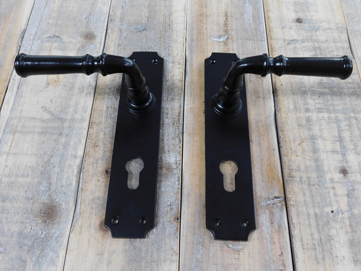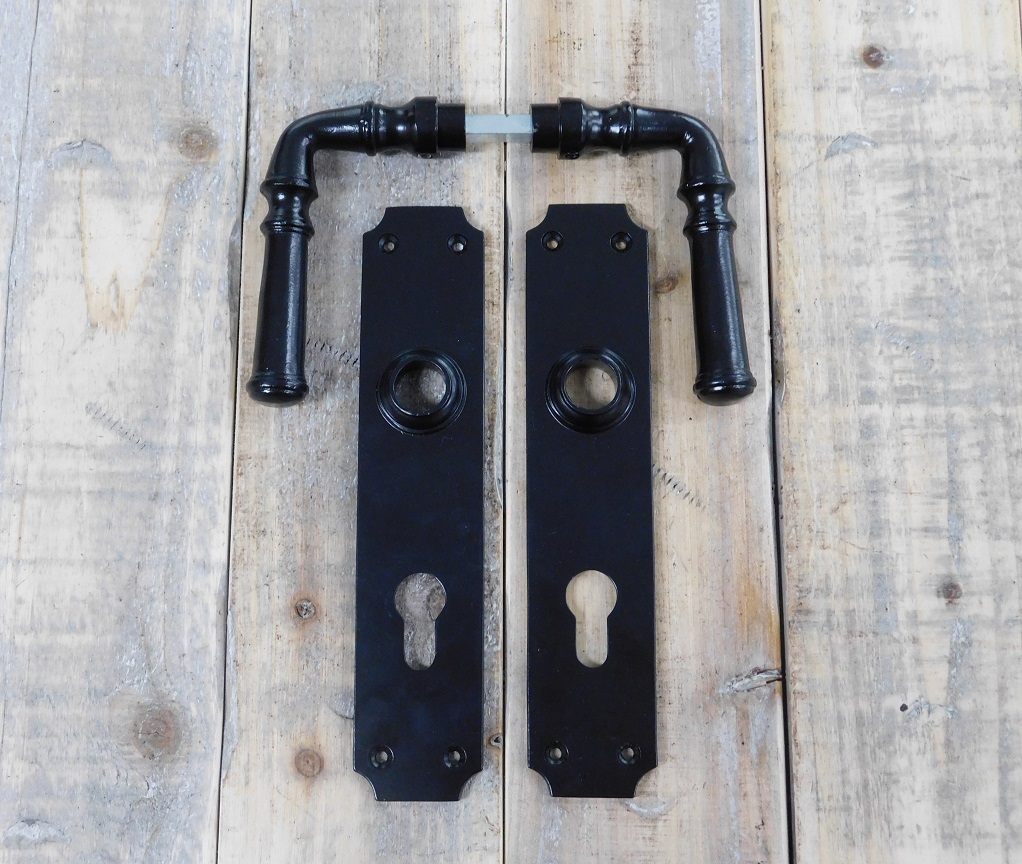 The set includes 2 handles and 2 long door plates + mandrel, and is made of high quality iron with a black powder coating.