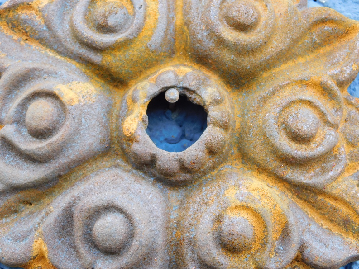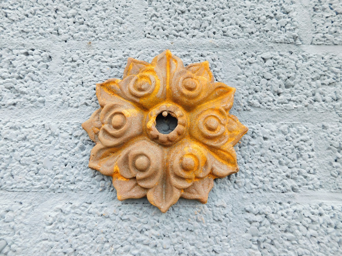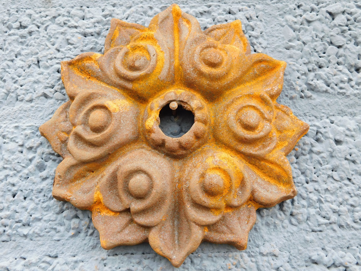 Such an anchor provides the connection between 2 elements: the oak beams that were connected to the wall, with this beautiful ornament. In the old days, this ornament was fixed in the beam with a wood screw and the ornament came on the wall from the outside.
