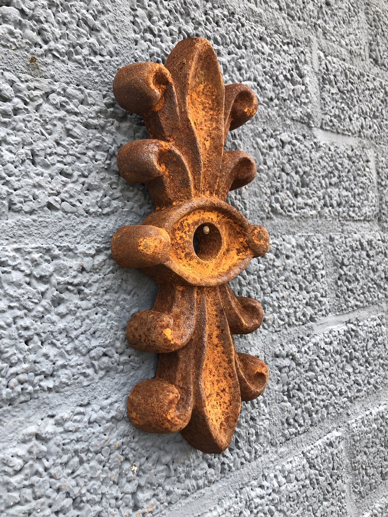 Such an anchor provides the connection between 2 elements: the oak beams that were connected to the wall, with this beautiful ornament. In the old days, this ornament was fixed in the beam with a wood screw and the ornament came on the wall from the outside.