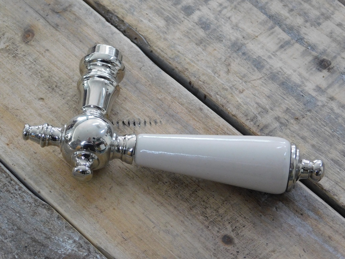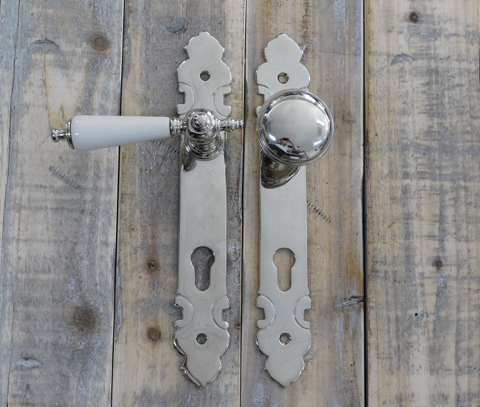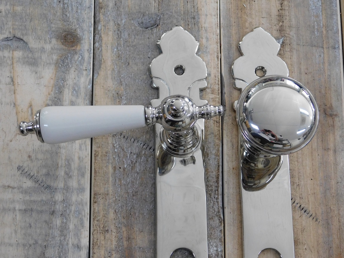 Beautiful complete set of door hardware consisting of: a door handle with porcelain grip, a door knob and two long door plates + handle pin.