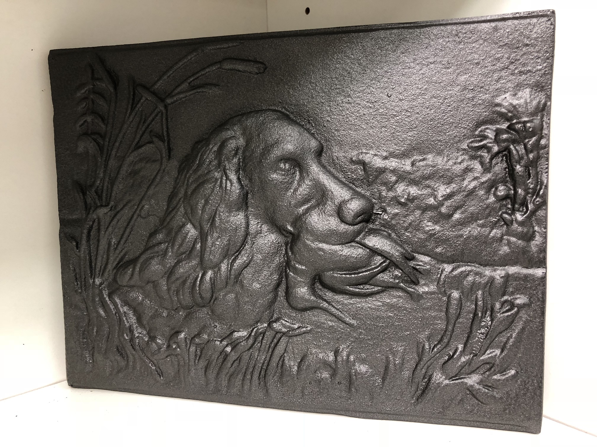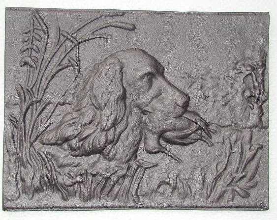 Open haard plaat, jacht tafereel, wandornament, DUCK-DOG, massief gietijzer, zware uitvoering