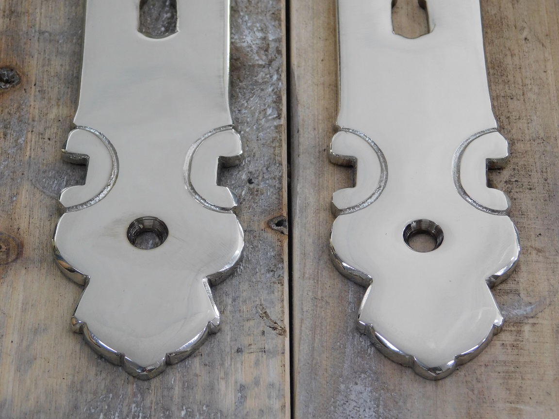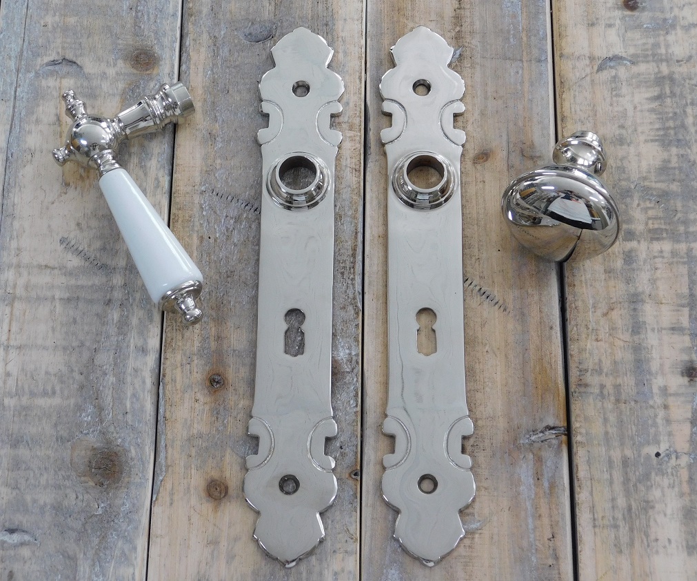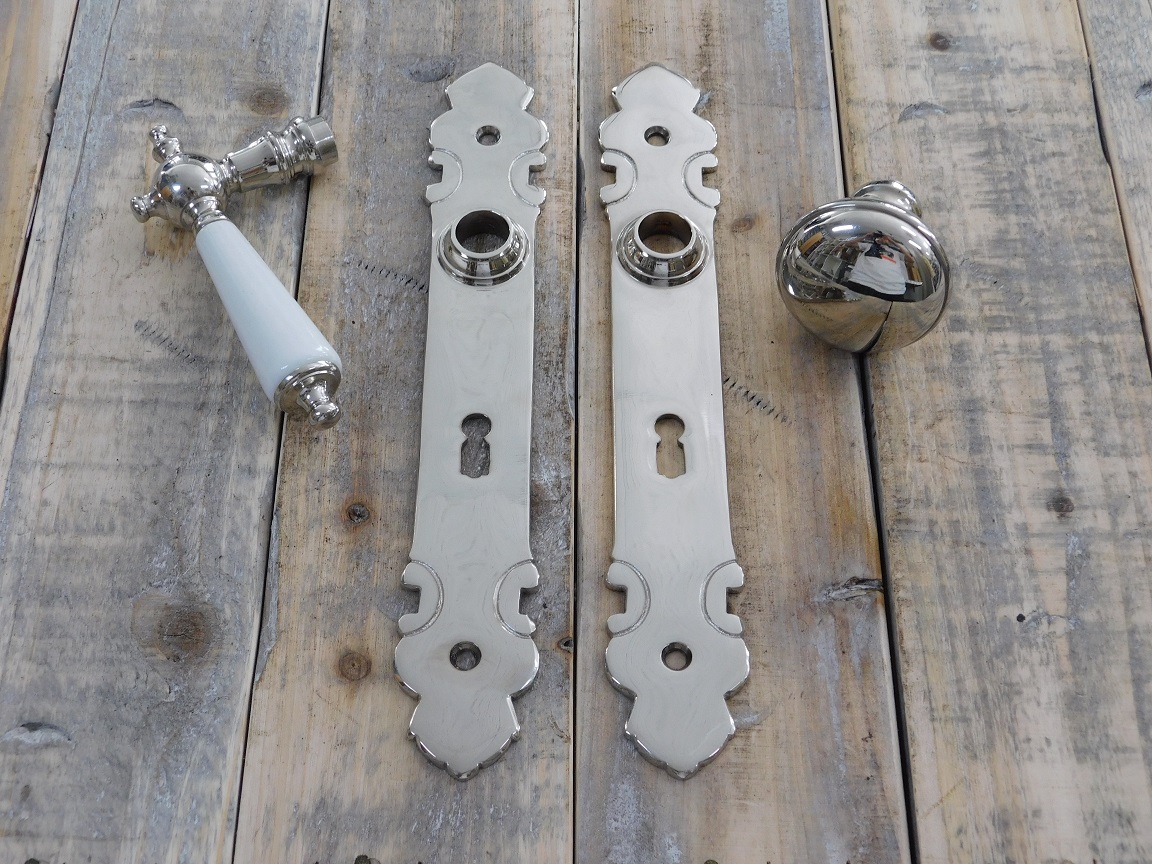 A beautiful cottage retro door hardware set in polished nickel - consisting of beautiful long plates, a latch with fine porcelain handle and a door knob.
