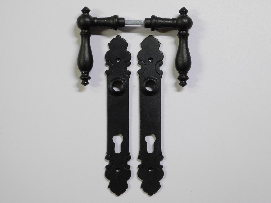The set consists of two elegantly shaped handles and two matching door plates (long plates) with keyhole. (PC 92)