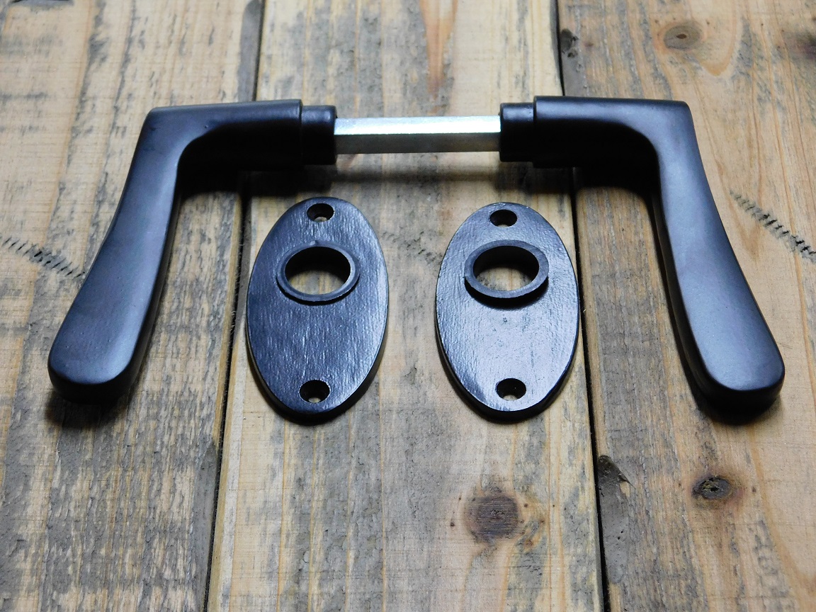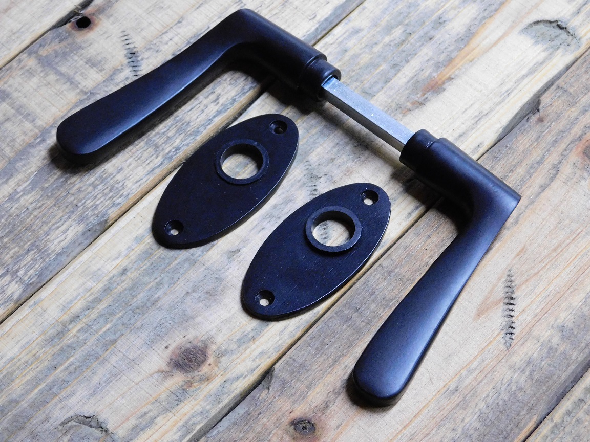 The door handles are suitable for interior doors with a thickness of 40 to 60 mm and come with matching oval rosettes made of iron for a sleek finish.