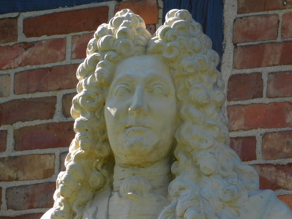 The characteristic curly wig, the refined facial expression, and the graceful clothing details give this bust an authentic and aristocratic appearance.