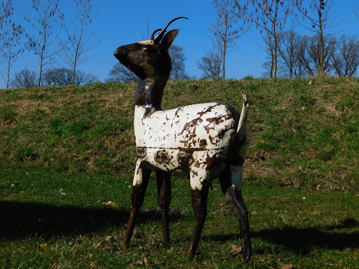 De metalen structuur geeft de vacht een speels en artistiek effect, terwijl de krachtige houding en de markante horens zorgen voor een stoere en levendige uitstraling.