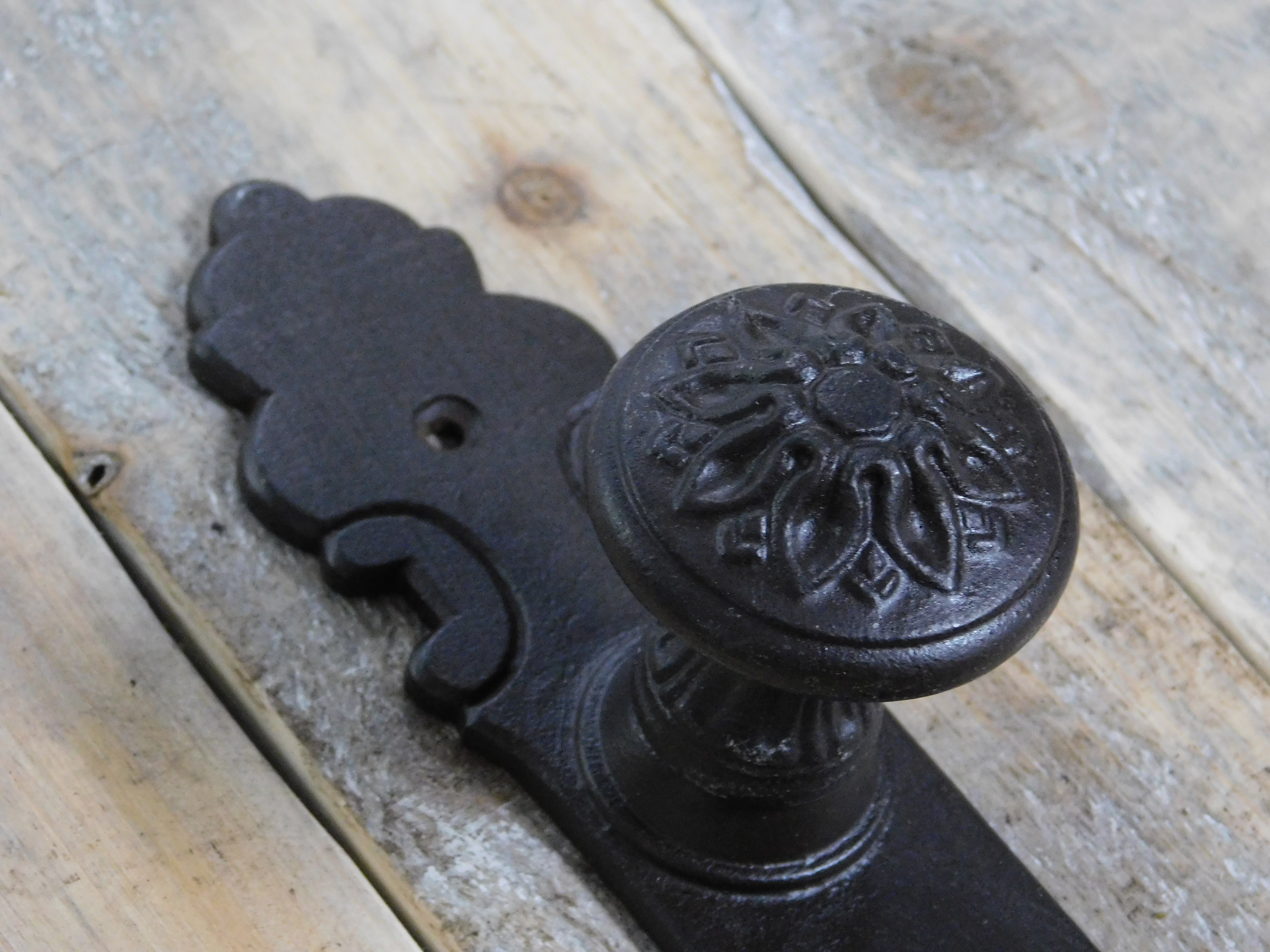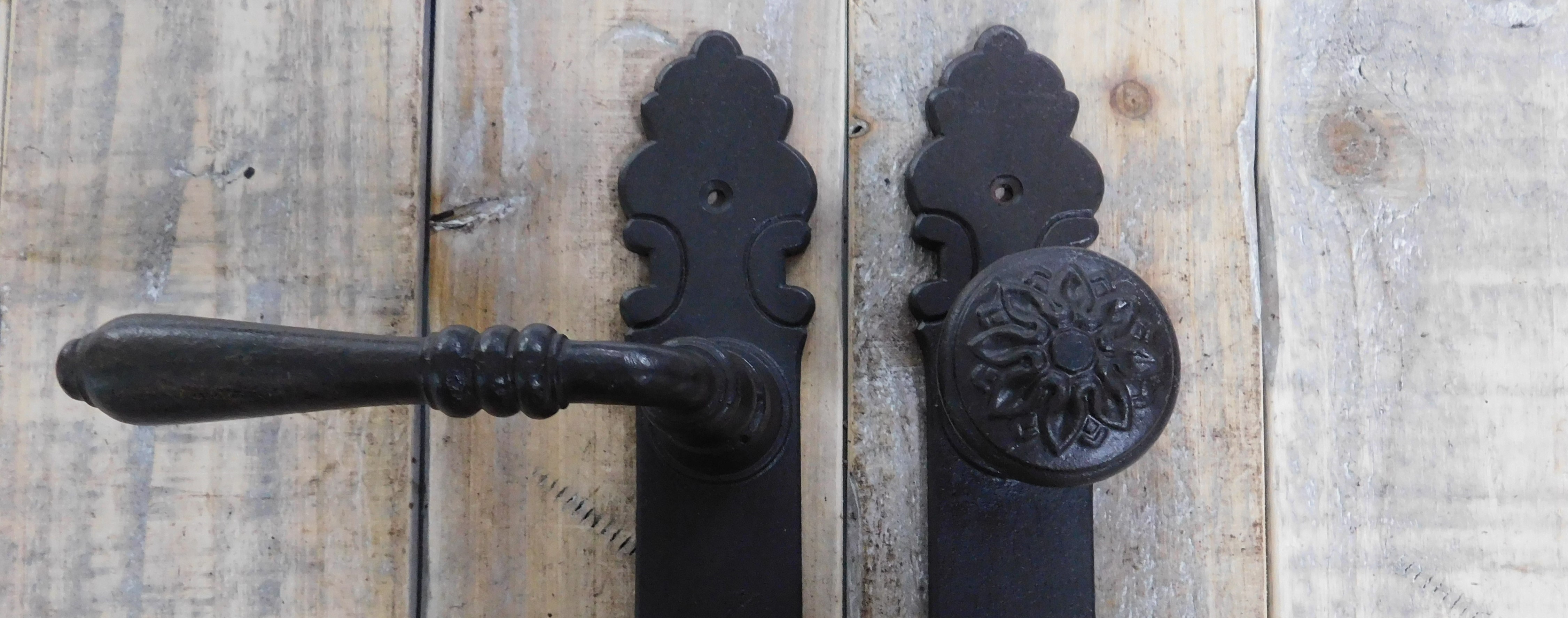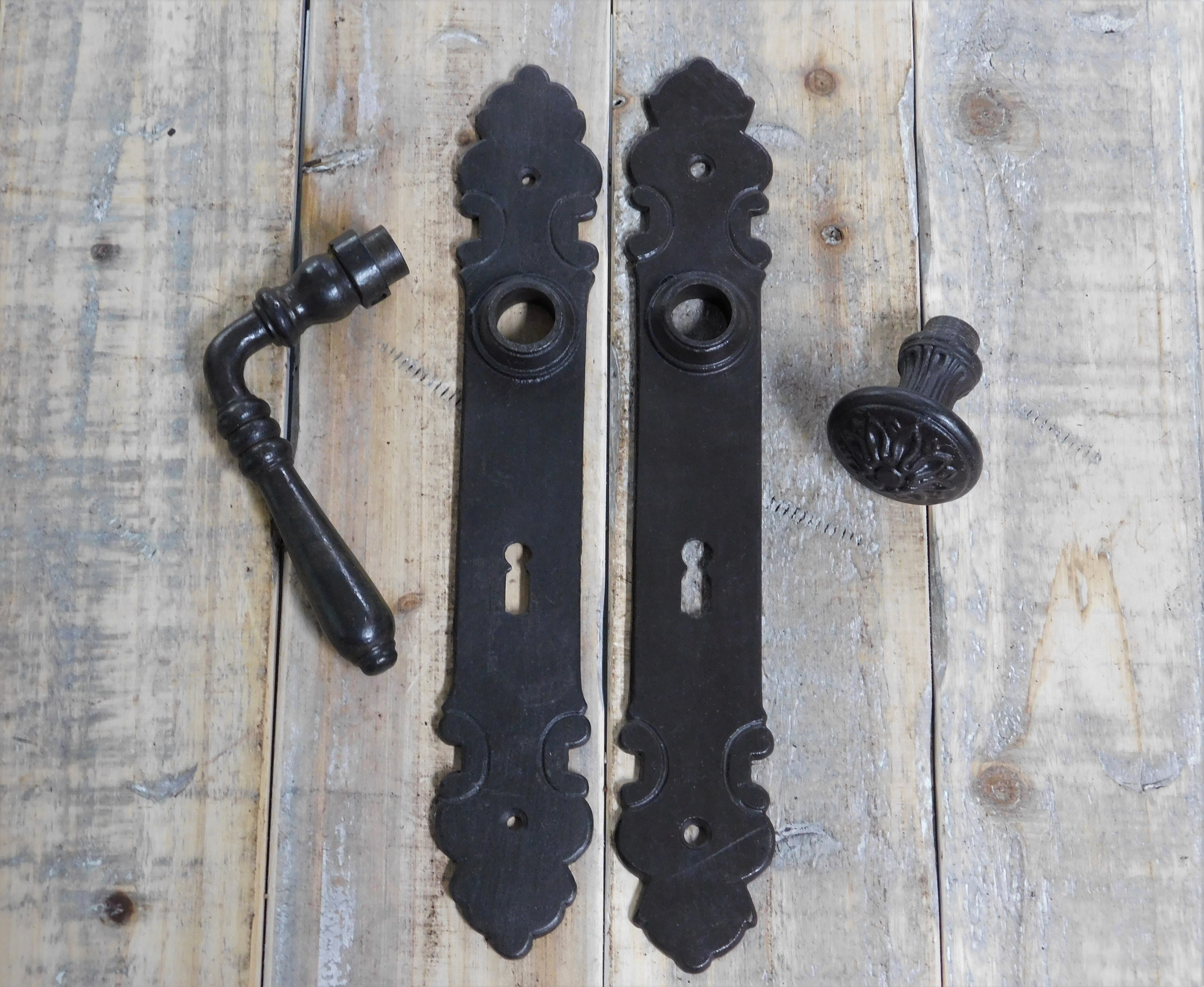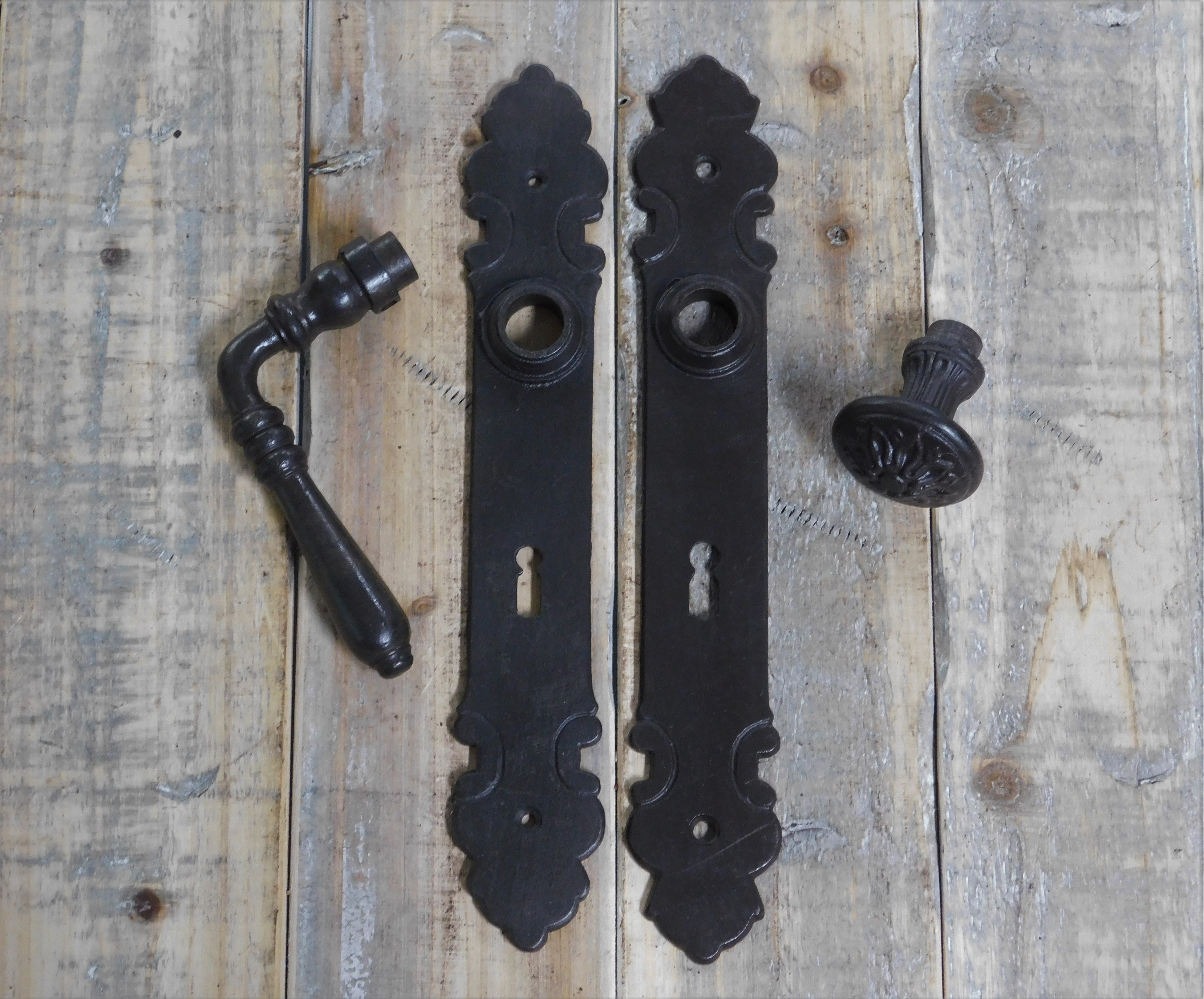 De mooie deurknop "Pinto" wordt gecombineerd met 1 klink en 2 lange platen - gemaakt van antieke ijzer en gewaxt.