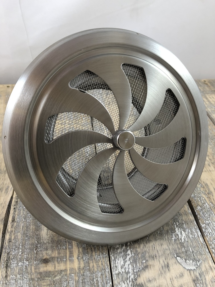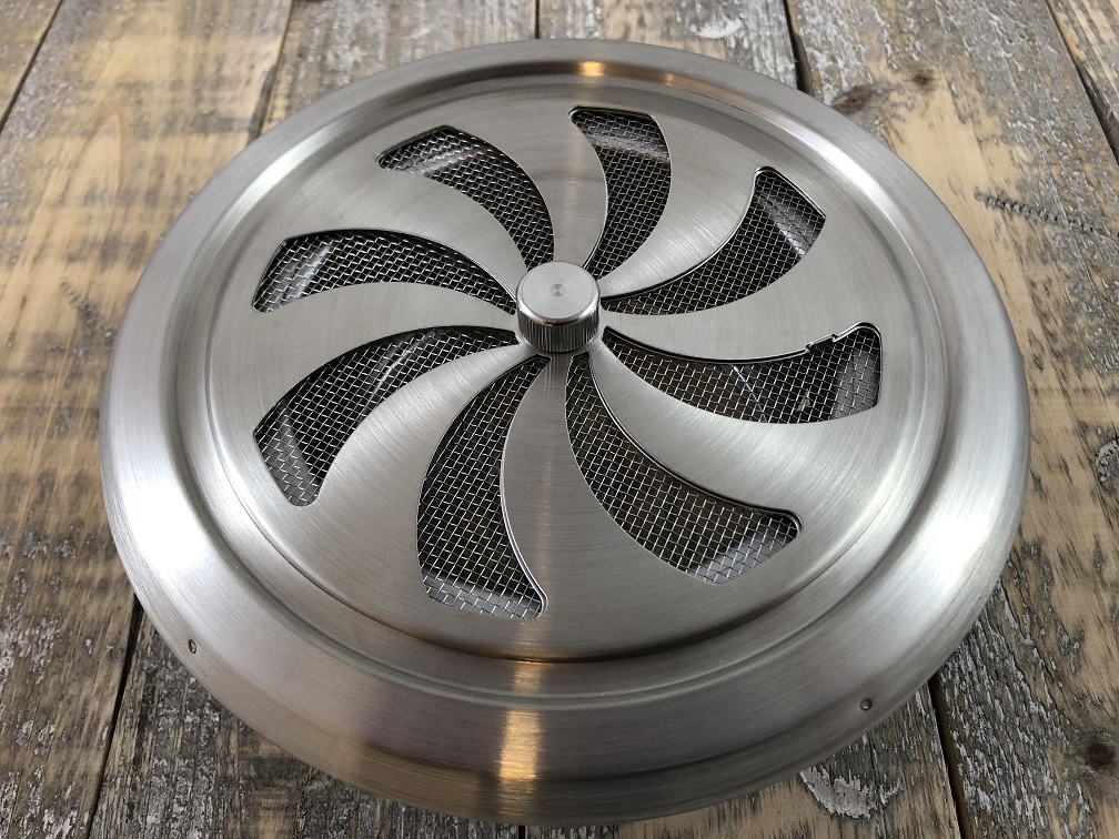 Het ronde ventilatierooster kan worden gebruikt voor zwaartekrachtventilatie en voor de distributie van warme lucht uit de haard en maakt de implementatie van de toevoerluchtverwarmingsinstallatie in andere ruimten mogelijk. De bevestigingsmaat van het rooster is aangepast aan de diameter van geïsoleerde flexibele kanalen die worden gebruikt om warme lucht te verdelen. Het rooster is envoudig af te stellen en is voorzien van insectengaas.