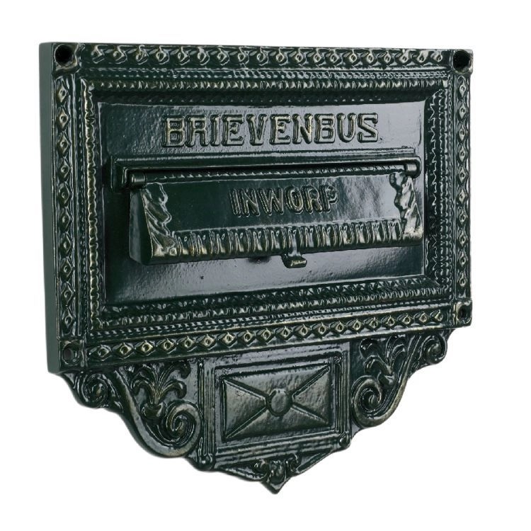 De sierlijke details, reliëfletters en decoratieve afwerking geven deze brievenbus een authentieke en charmante uitstraling.
