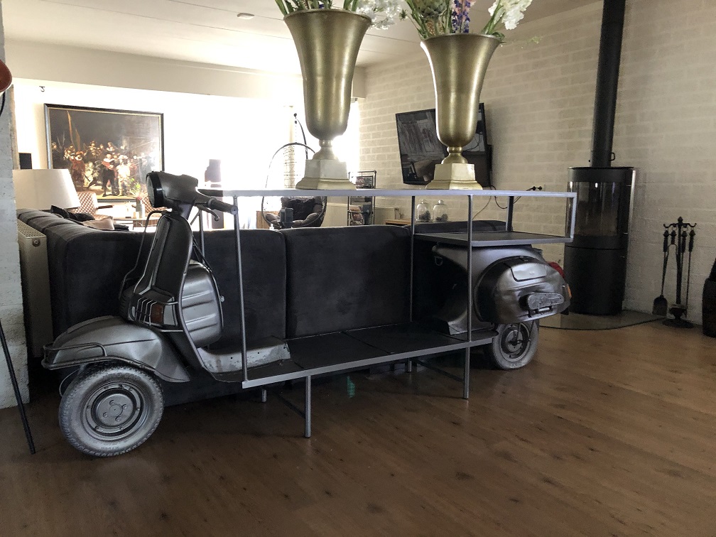 Kijk goed naar de foto's, die spreken voor zich, wat een geweldig meubelstuk. Een scooter motor die een tafel draagt met er in ontworpen mooie opbergruimtes.