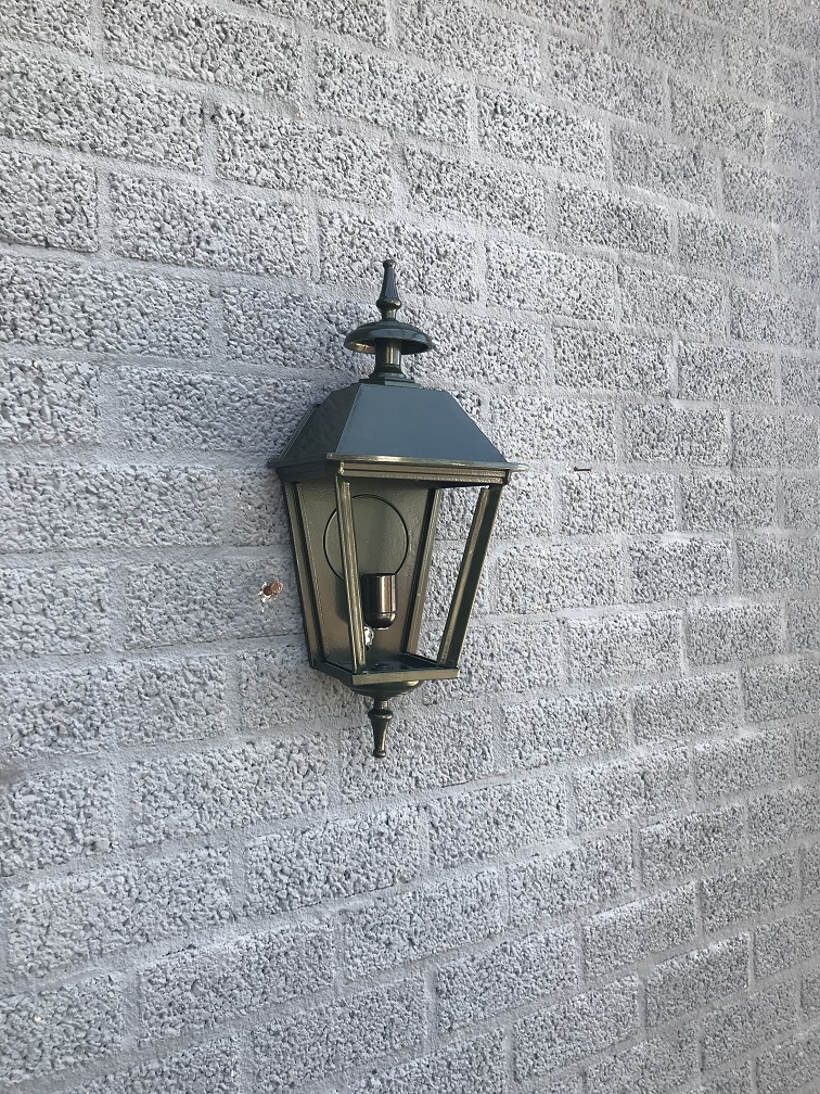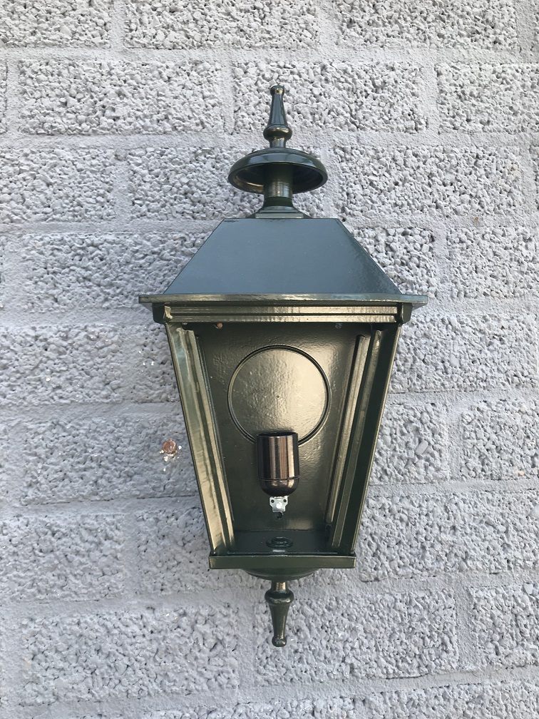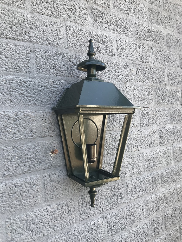 Een hele stijlvolle wandlamp voor in de tuin, prachtige tuindecoratie! Het is gemaakt naar een antiek origineel in de kleur groen, de koperen kap maakt de lamp helemaal af!Â